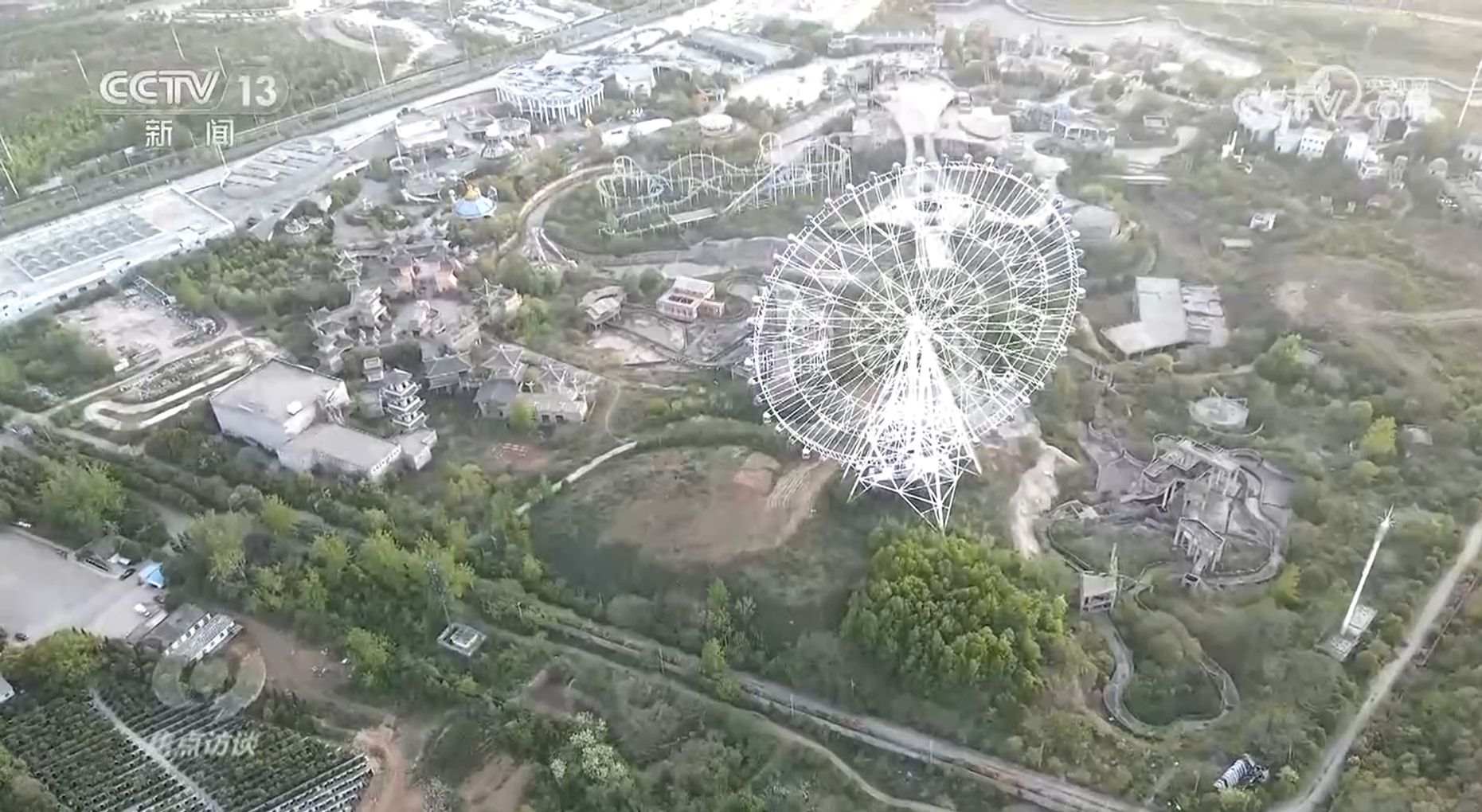 “淮南之眼”號稱亞洲最高的山體摩天輪,直徑120米,高達168米,相當(dāng)于55層樓高,但經(jīng)過十多年的日曬雨淋,早已銹跡斑斑,成為了危險娛樂設(shè)施。雖然歡樂園現(xiàn)在看起來破敗不堪,但13年前它可是當(dāng)?shù)氐拿餍琼椖?,一時風(fēng)光無限。2011年,時任淮南市市長曹勇在酒店會見志高集團董事局主席江東廷時表示,市委、市政府將全力支持項目的建設(shè),確保歡樂園按計劃盛大開園。記者翻閱2010—2013年的淮南市政府工作報告時,也發(fā)現(xiàn)這個項目每年都是政府工作的重點內(nèi)容之一。