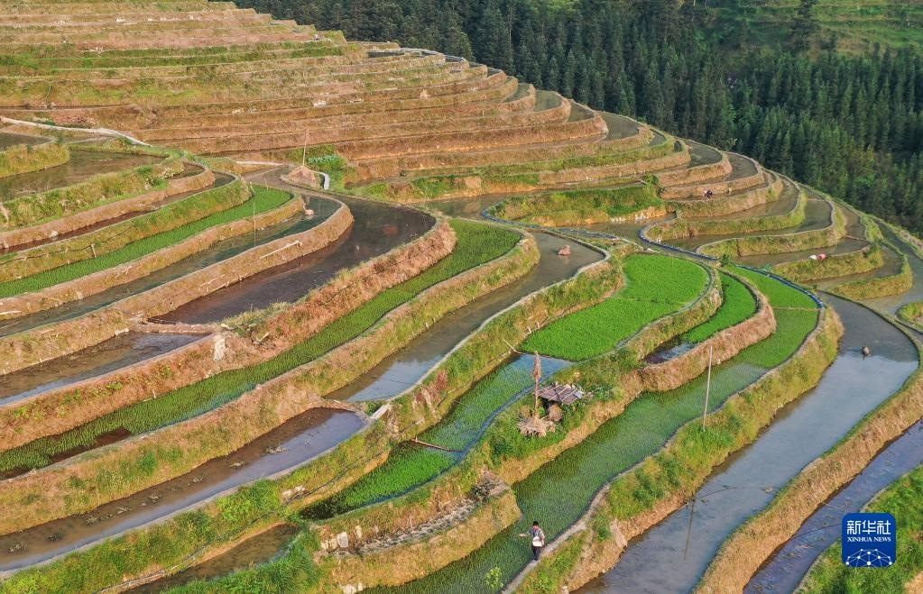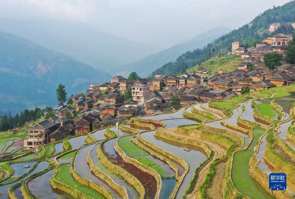 5月6日拍攝的貴州省從江縣加榜鄉(xiāng)加車村的梯田(無人機照片)。   新華社發(fā)(羅京來 攝)