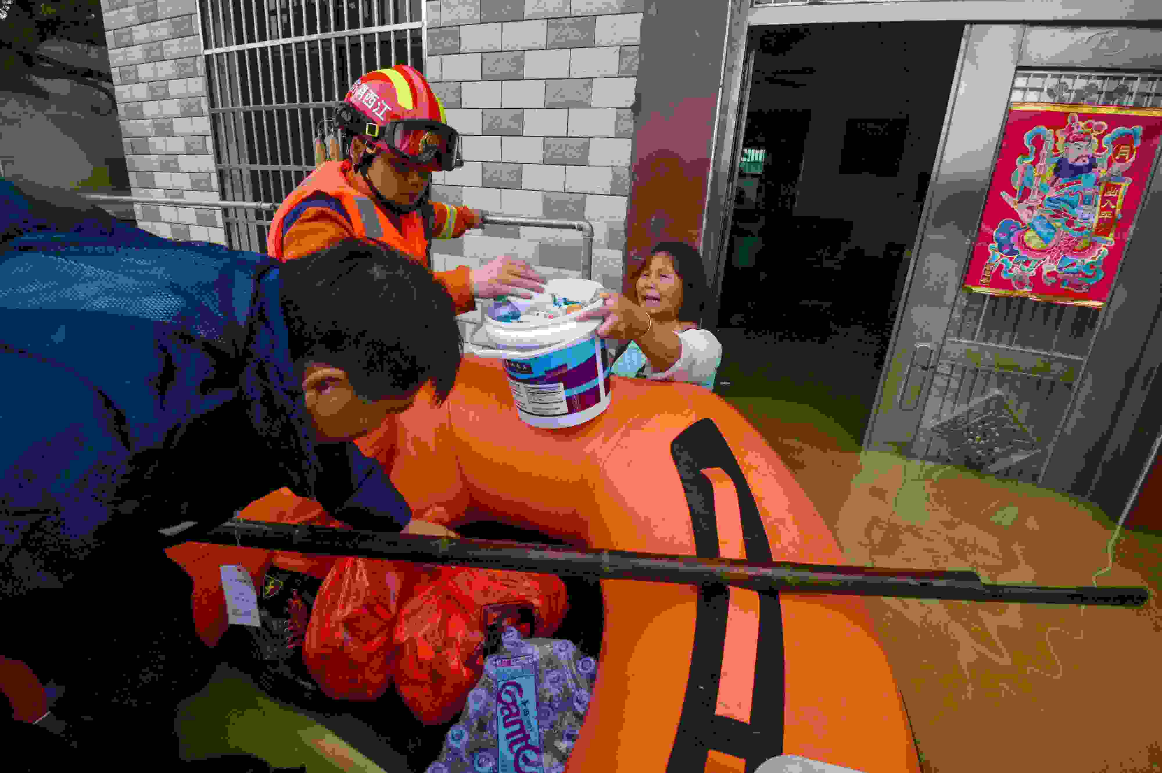 2023年5月6日,江西吉安,新干縣消防救援大隊隊員在麥斜鎮(zhèn)拿埠村給受困群眾運送生活物資。 視覺中國
