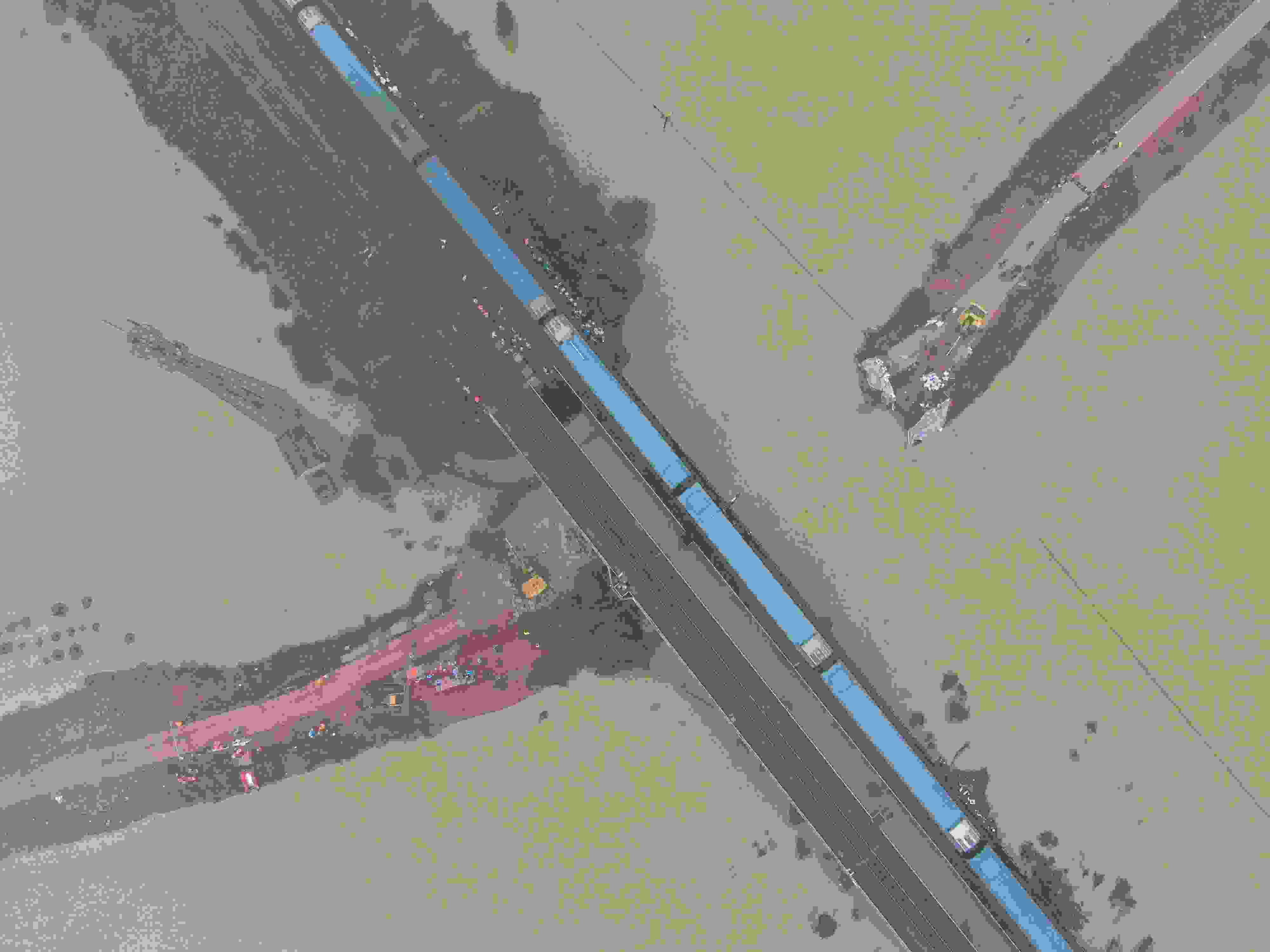 2023年5月6日,江西宜春,航拍清豐堤河堤潰口現(xiàn)場,一列火車從潰口上方的鐵路橋上經(jīng)過,橋下的救援隊伍正在開展搶險救援工作。 視覺中國