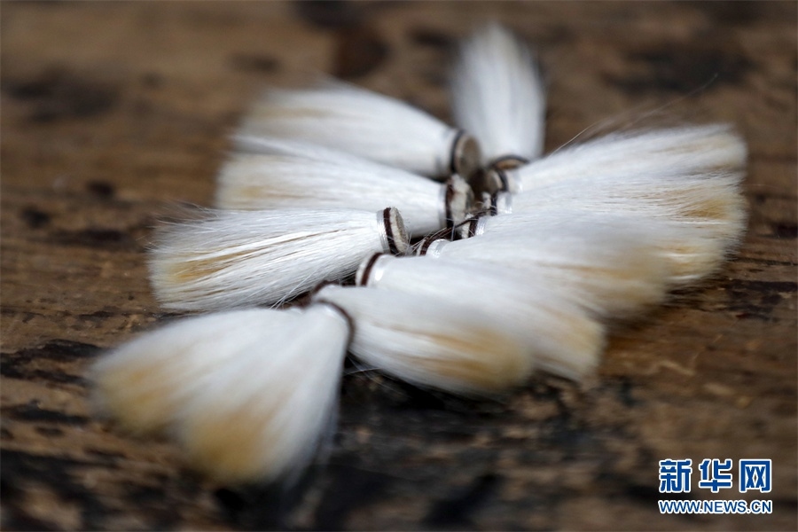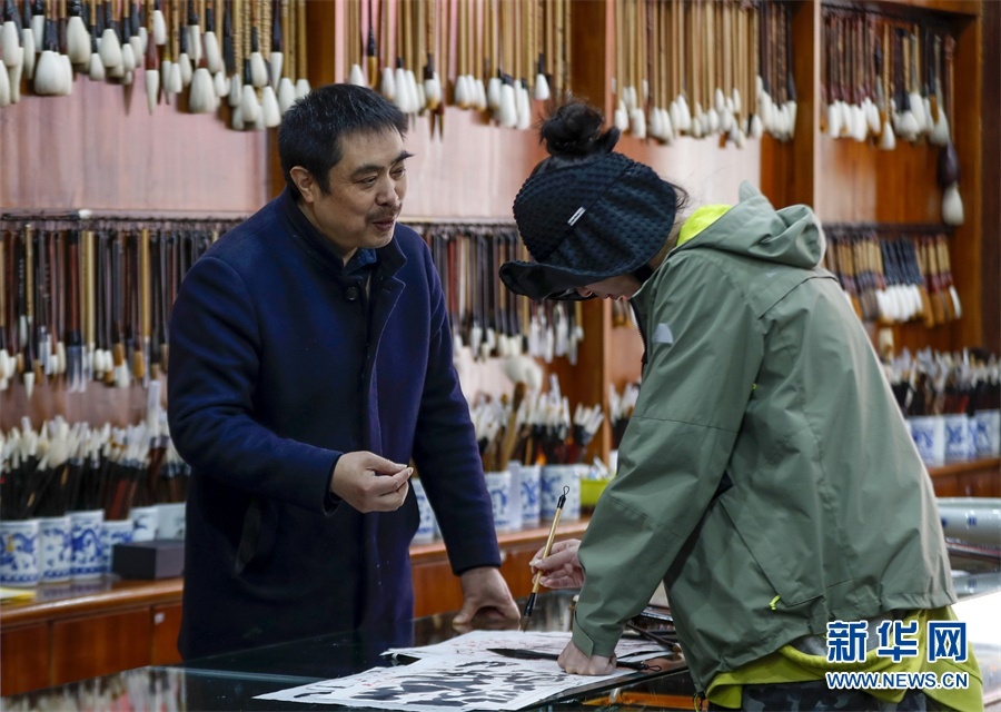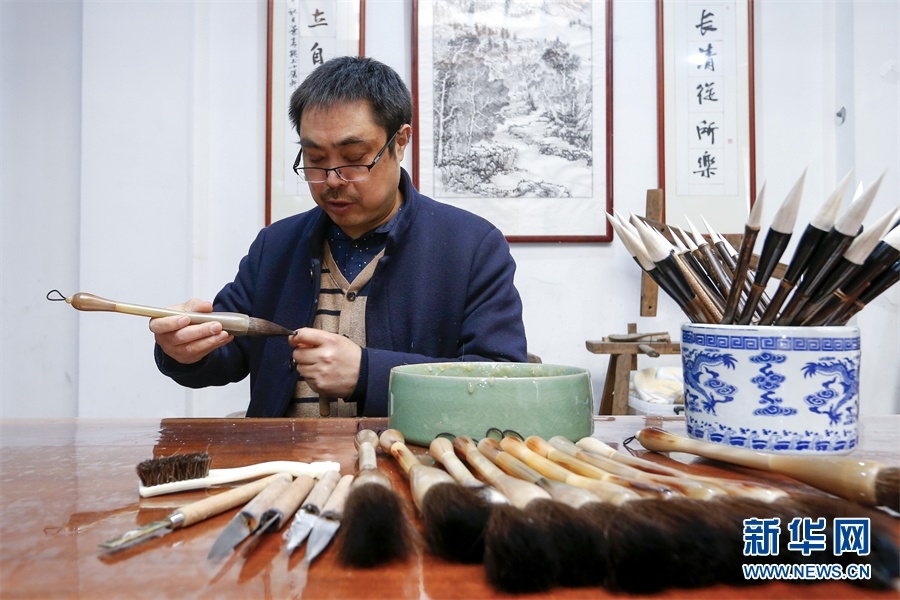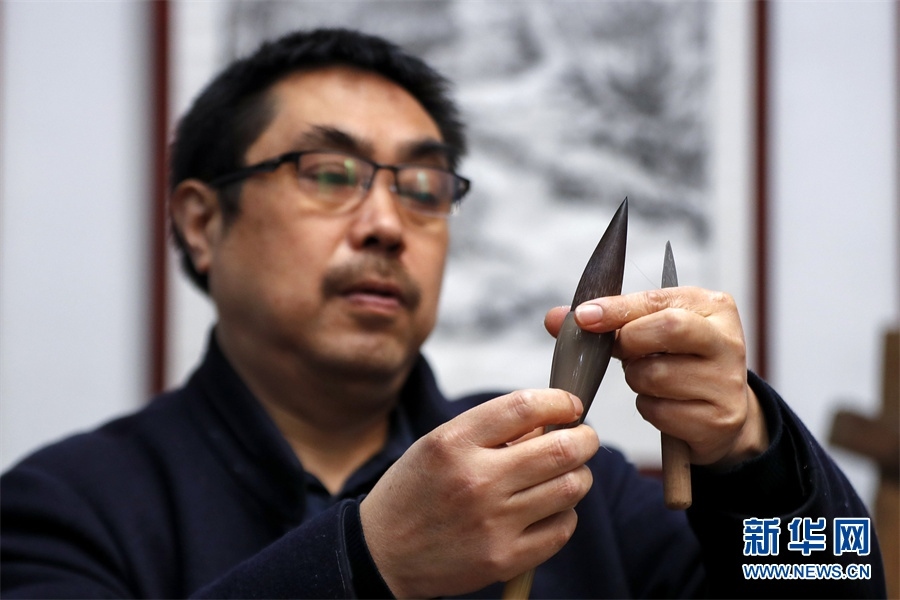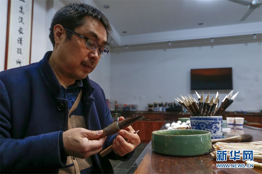 一支好的徽筆,不僅要保留傳統(tǒng)工藝,且要在原基礎上不斷創(chuàng)新、改良。楊文尤其重視書畫家對筆的使用反饋:“因為他們對用筆最挑剔,而且現(xiàn)代書畫家創(chuàng)作方式和作品不斷創(chuàng)新,對毛筆也有新的要求,他們提出的要求我總是盡力去滿足,也使得制筆技藝進一步得到了提高?!? 新華網(wǎng)發(fā)(施亞磊 攝)