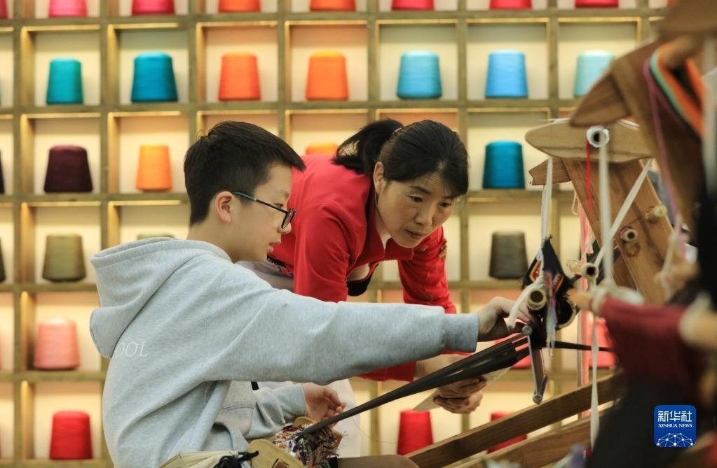 5月12日,來自上海包玉剛實驗學(xué)校的學(xué)生在張家界市武陵源區(qū)乖幺妹土家族織錦基地學(xué)習(xí)體驗土家族織錦非遺技藝。