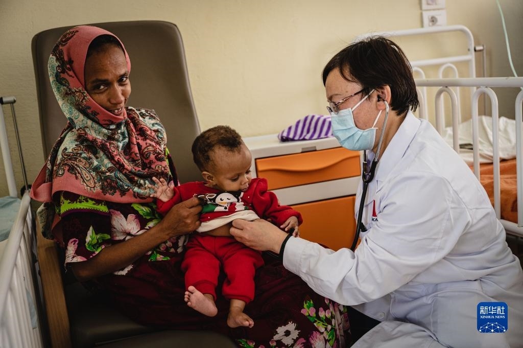 5月9日,在厄立特里亞首都阿斯馬拉的奧羅特醫(yī)院,醫(yī)療隊(duì)兒科醫(yī)生張春燕(右)為小朋友聽(tīng)診。   新華社記者 王冠森 攝