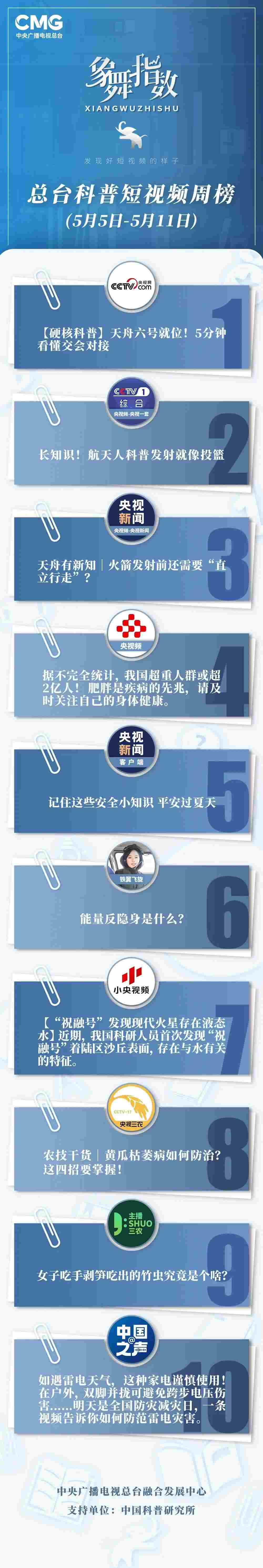 中央廣播電視總臺(tái)“象舞指數(shù)”評議品牌,推出科普短視頻周榜、總臺(tái)科普短視頻周榜。在2023年5月5日-5月11日,值得注目的內(nèi)容有: