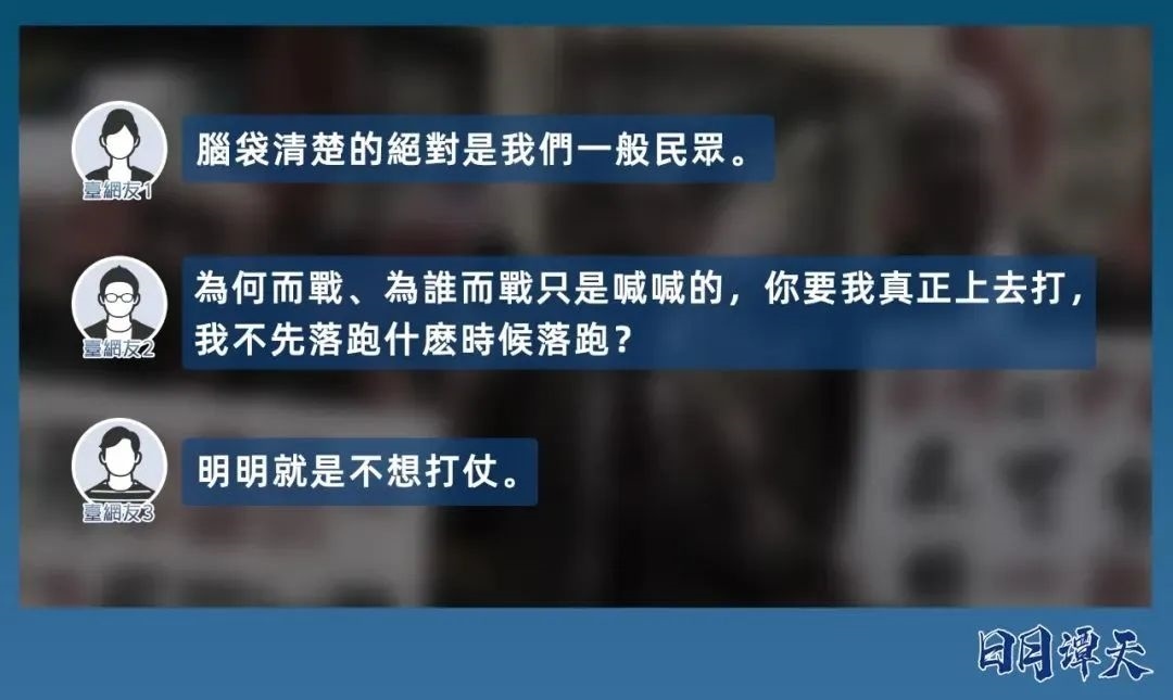 譚主一位來自新北的青年朋友小章說,他服四個(gè)月義務(wù)兵役時(shí)“每天都想要逃離”,服完役才感到解脫,那段時(shí)間的心情就是“來不及了快下車”“民進(jìn)黨就是‘臺(tái)獨(dú)’啊,我不想去給他們當(dāng)炮灰”。