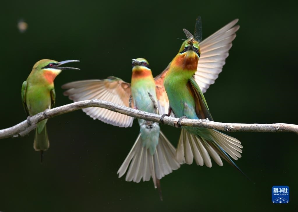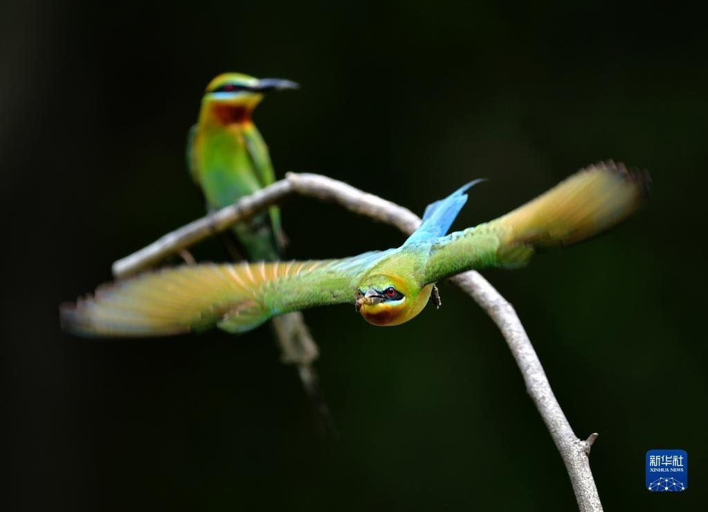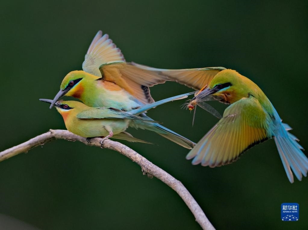 5月20日,兩只栗喉蜂虎在樹枝上玩耍。   新華社記者 魏培全 攝