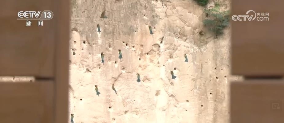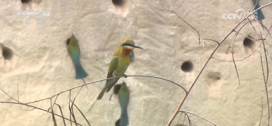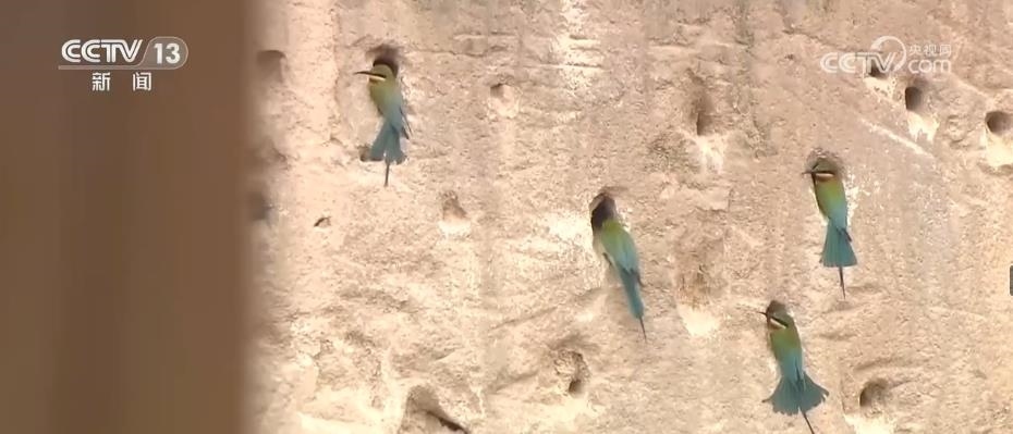 眼前,這些看上去很像是泥巴墻的建筑,其實(shí)是人工建造的候鳥巢穴。根據(jù)栗喉蜂虎的生活習(xí)慣,保護(hù)區(qū)工作人員專門在它們回來之前就對懸壁進(jìn)行修整,讓這些美麗的小鳥更方便安家。