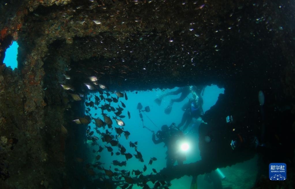 攝影愛好者在蜈支洲島海域海洋牧場拍攝沉船魚礁內(nèi)的魚群(2021年5月21日攝)。