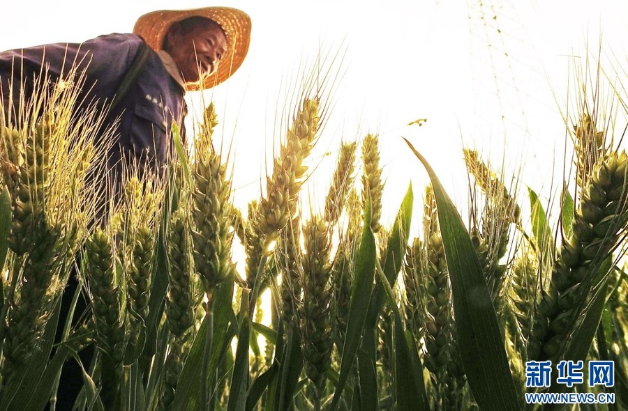 ??夕陽(yáng)下,麥農(nóng)察看小麥長(zhǎng)勢(shì)。新華網(wǎng) 發(fā)(高新生 攝)??