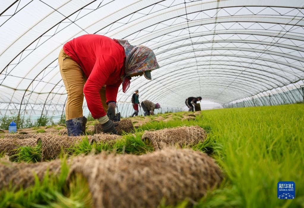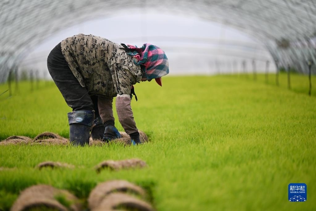5月23日,達(dá)拉特旗昭君鎮(zhèn)村民在育秧苗大棚中起秧。   新華社記者劉磊攝