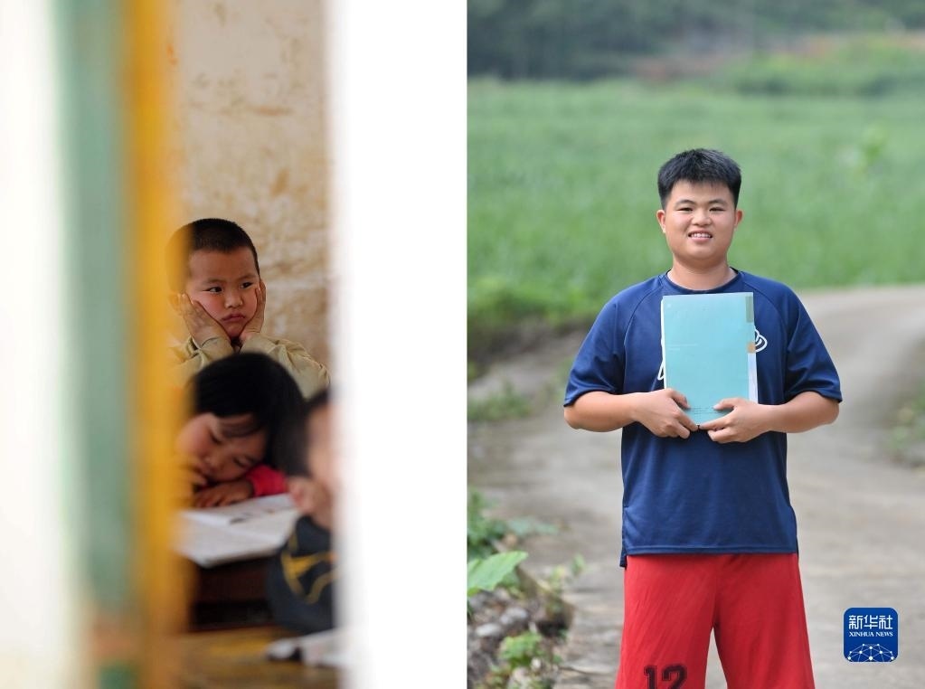 拼版照片:左圖為2012年3月27日,在大化瑤族自治縣大化鎮(zhèn)仁良小學(xué),6歲的韋康濤在教室里上課(新華社記者黃孝邦攝);右圖為在大化瑤族自治縣高級(jí)中學(xué)讀高二的韋康濤(新華社記者胡星宇 2023年5月21日攝)。韋康濤的夢(mèng)想是考上理想的大學(xué)。