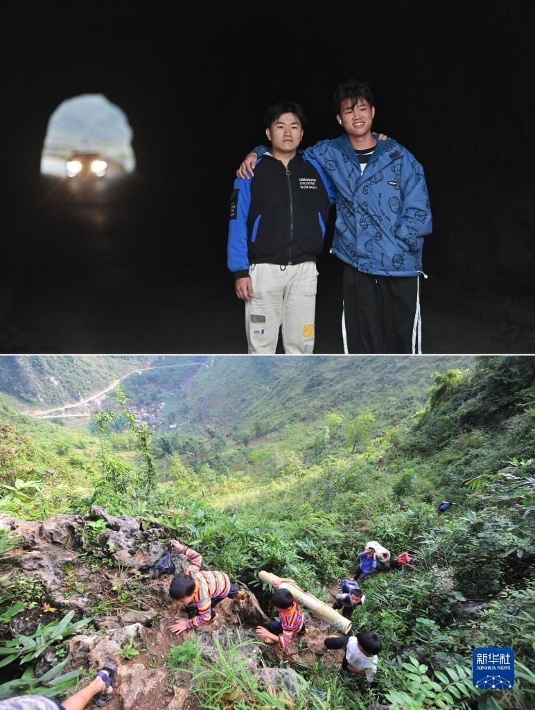 拼版照片:上圖為2023年1月20日,在大化瑤族自治縣板升鄉(xiāng)弄勇村,22歲的蒙宣任(左)和弟弟蒙宣汰站在通往弄勇小學(xué)的隧道旁合影,隧道上方是他們兒時(shí)上學(xué)需要攀爬的“天梯”;下圖為2012年9月3日,在大化瑤族自治縣板升鄉(xiāng)弄勇村,蒙宣汰(左一)、蒙宣任(左二)爬山路去學(xué)校。蒙宣任目前在遼寧省交通高等??茖W(xué)校讀書,弟弟蒙宣汰從技校畢業(yè)后在廣東一家汽修廠上班。