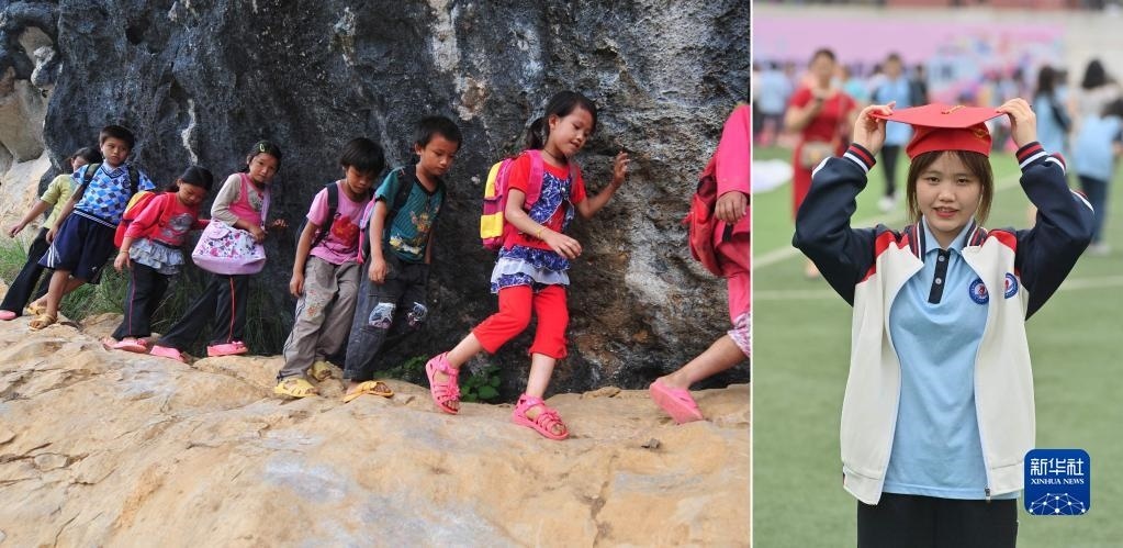 拼版照片:左圖為2012年9月3日,在大化瑤族自治縣板升鄉(xiāng)弄雷村,8歲的蒙麗丹(右一)爬懸崖去學(xué)校讀書;右圖為2023年5月20日,蒙麗丹在廣西大化瑤族自治縣高級(jí)中學(xué)高三成人禮上(新華社記者胡星宇攝)。即將參加高考的蒙麗丹,希望以后能回到大山里當(dāng)老師。