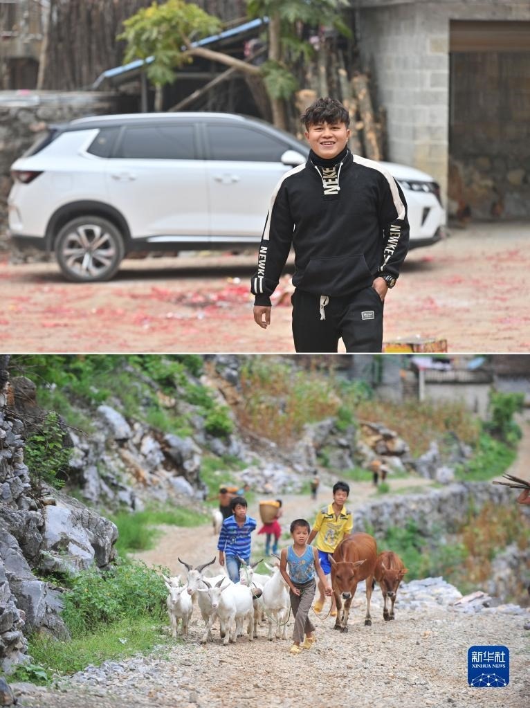 拼版照片:上圖為2023年1月21日,在大化瑤族自治縣板升鄉(xiāng)弄勇村,22歲的蒙宣朝站在自己剛剛購(gòu)買的汽車前;下圖為2012年7月16日,在大化瑤族自治縣板升鄉(xiāng)弄勇村,11歲的蒙宣朝(前)利用暑假幫家里放牧。技校畢業(yè)后,蒙宣朝到廣東工作。