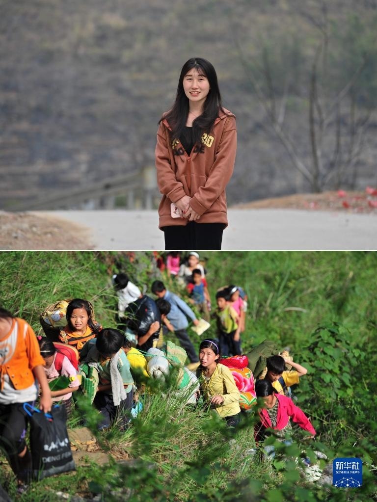 拼版照片:上圖為2023年5月27日,22歲的蒙秋艷站在她就讀的廣西醫(yī)科大學(xué)校門口(新華社發(fā));下圖為2012年9月3日,在大化瑤族自治縣板升鄉(xiāng)弄雷村哈保屯,11歲的蒙秋艷(右一)在懸崖邊護(hù)著低年級(jí)的小伙伴回家(新華社記者黃孝邦攝)。2021年,蒙秋艷以優(yōu)異的成績(jī),考取廣西醫(yī)科大學(xué)。