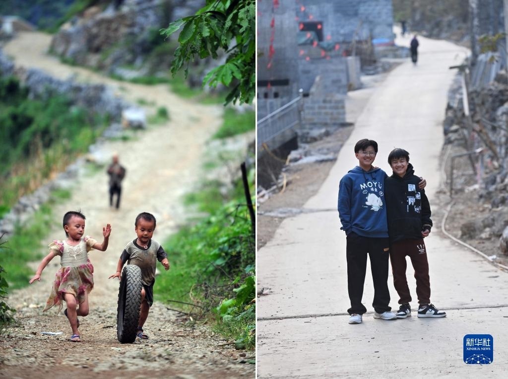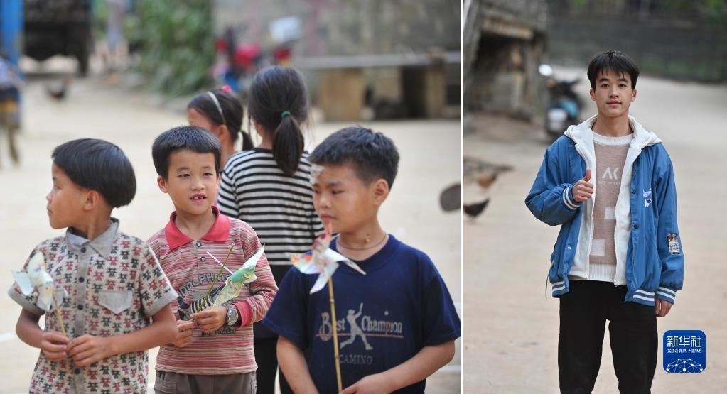 拼版照片:左圖為2012年7月4日,在大化瑤族自治縣板升鄉(xiāng)弄勇小學(xué),7歲的蒙旺兵(左二)在校園里玩風(fēng)車;右圖為2023年1月25日,在大化瑤族自治縣板升鄉(xiāng)弄勇村,正在桂林理工大學(xué)讀大一的蒙旺兵寒假回家時(shí)在村中留影?! ⌒氯A社記者 黃孝邦 攝