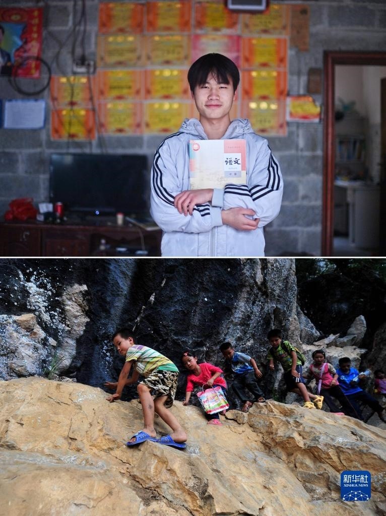 拼版照片:上圖為2023年5月20日,蒙俐谷在大化瑤族自治縣第二中學(xué)高二年級(jí)教室里學(xué)習(xí)(新華社記者胡星宇攝);下圖為2012年9月3日,在大化瑤族自治縣板升鄉(xiāng)弄雷村,7歲的蒙俐谷(右一)爬懸崖去學(xué)校讀書(新華社記者黃孝邦攝)。一年后將參加高考的蒙俐谷,希望能考上理想的大學(xué)。