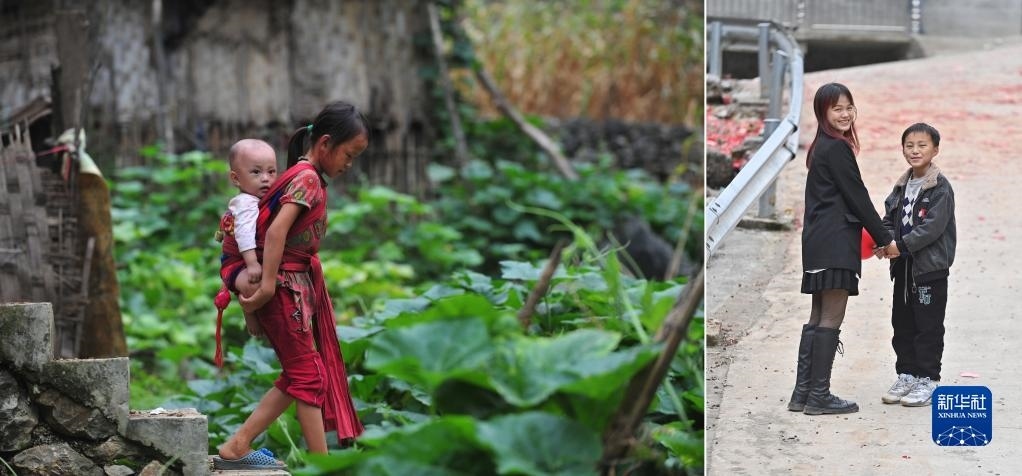 拼版照片:左圖為2012年7月16日,在大化瑤族自治縣板升鄉(xiāng)弄勇村,10歲的蒙柔玉背著弟弟蒙宣朋去玩耍;右圖為2023年1月20日,在大化瑤族自治縣板升鄉(xiāng)弄勇村,21歲的蒙柔玉(左)和12歲的弟弟蒙宣朋在一起。已經(jīng)從幼師畢業(yè)的蒙柔玉,一邊工作,一邊學(xué)習(xí)舞蹈,為自己兒時(shí)的歌舞夢(mèng)繼續(xù)努力。