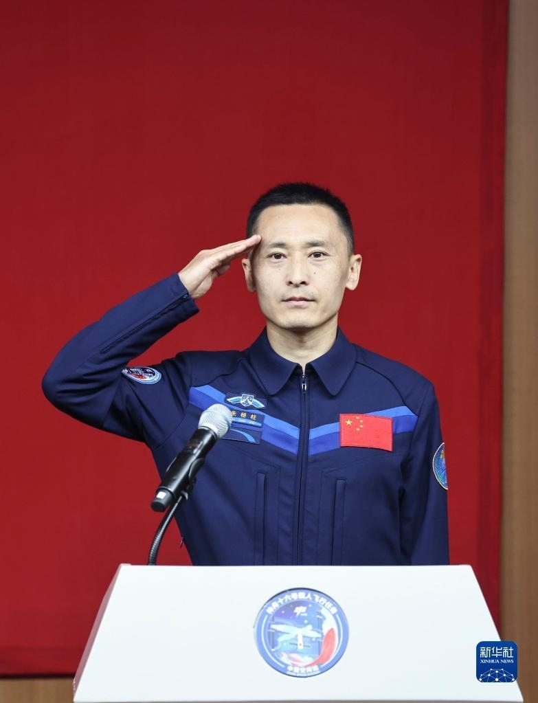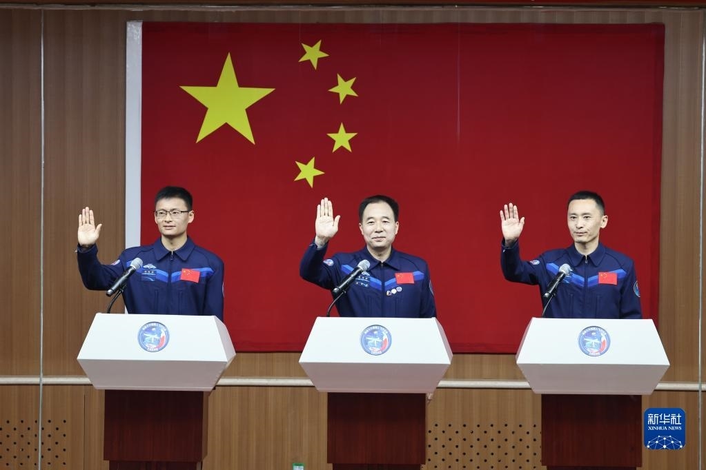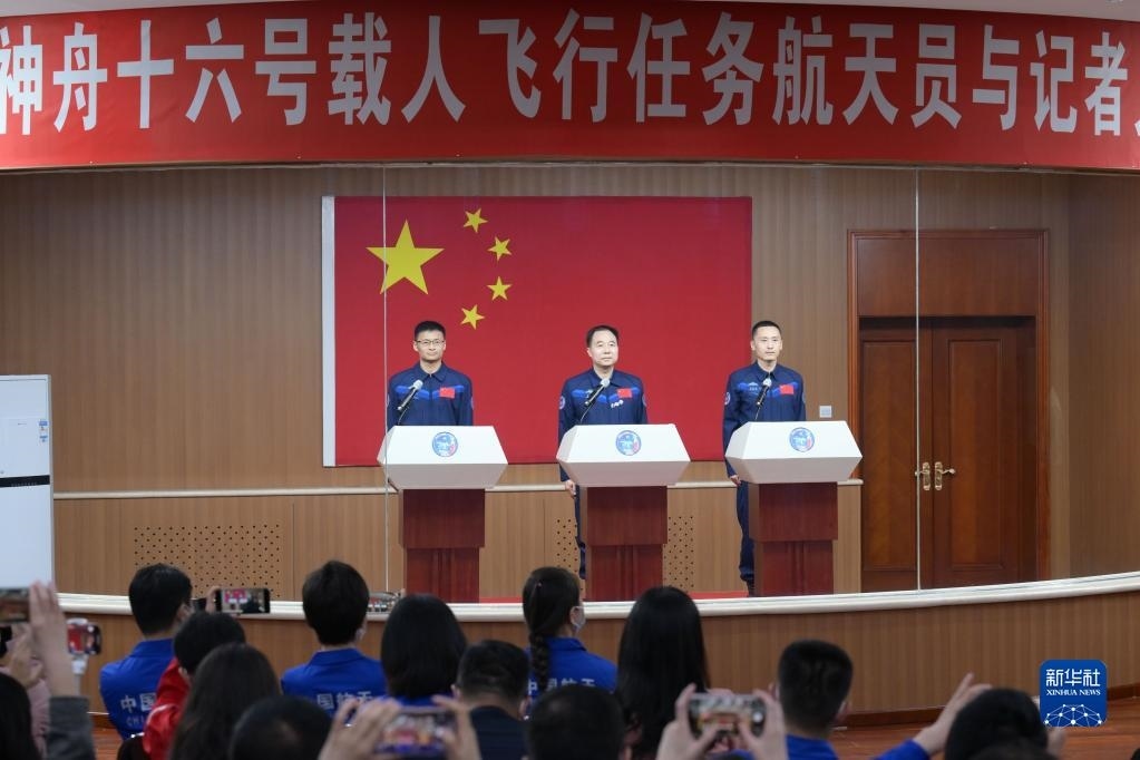 5月29日,神舟十六號(hào)航天員乘組與中外媒體記者集體見面會(huì)在酒泉衛(wèi)星發(fā)射中心問天閣舉行。這是指令長景海鵬(中)、航天飛行工程師朱楊柱(右)、載荷專家桂海潮揮手致意。   新華社記者 金立旺 攝