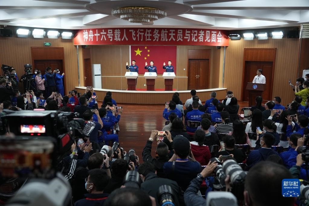 5月29日,神舟十六號(hào)航天員乘組與中外媒體記者集體見面會(huì)在酒泉衛(wèi)星發(fā)射中心問天閣舉行。這是指令長景海鵬(中)、航天飛行工程師朱楊柱(右)、載荷專家桂海潮回答記者提問。   新華社記者 金立旺 攝