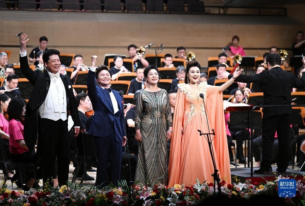 5月25日,在天津大劇院音樂(lè)廳,歌唱家王澤南(左一)、王宏偉(左二)、關(guān)牧村(左三)、張晏蓉等在舞臺(tái)上演出。