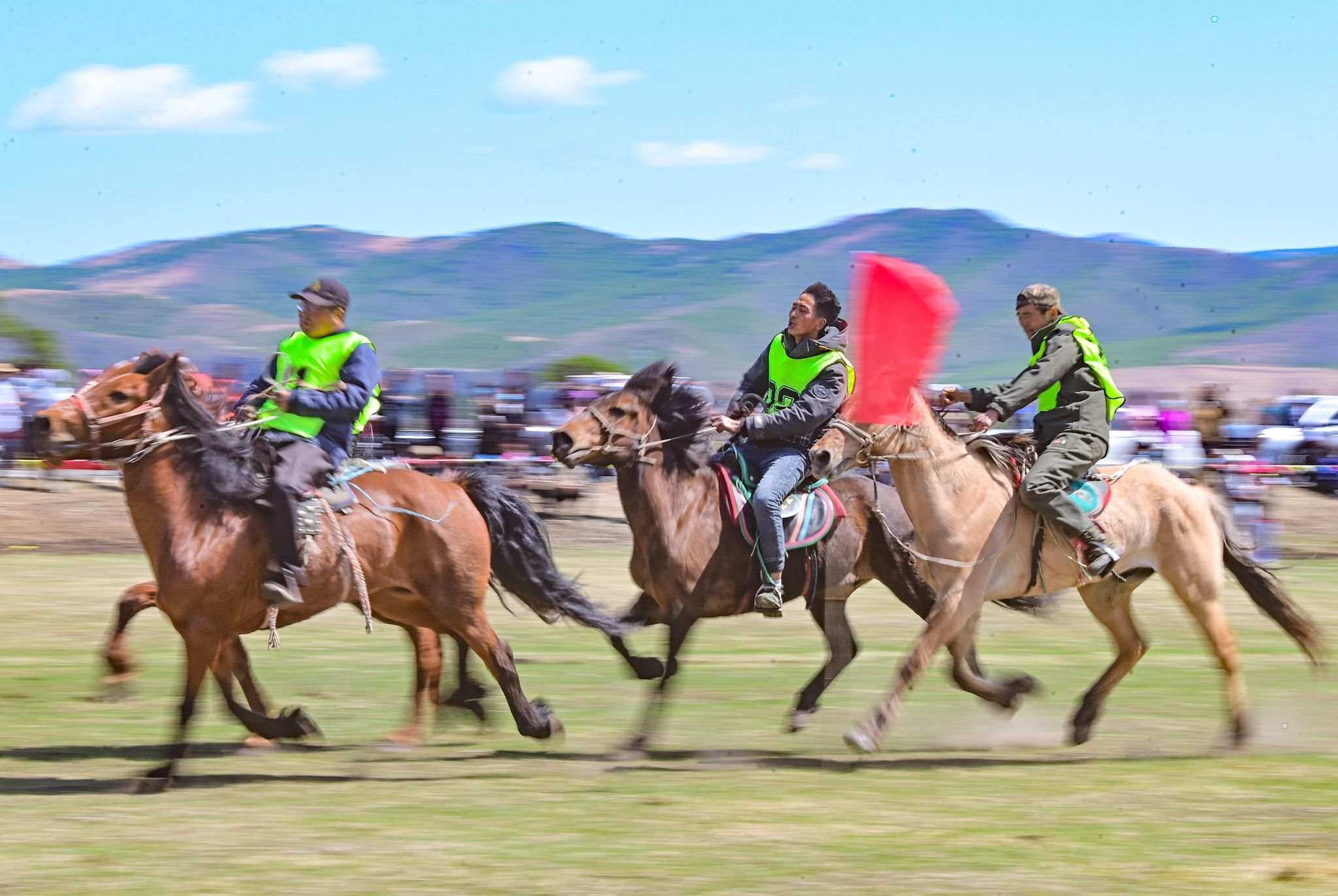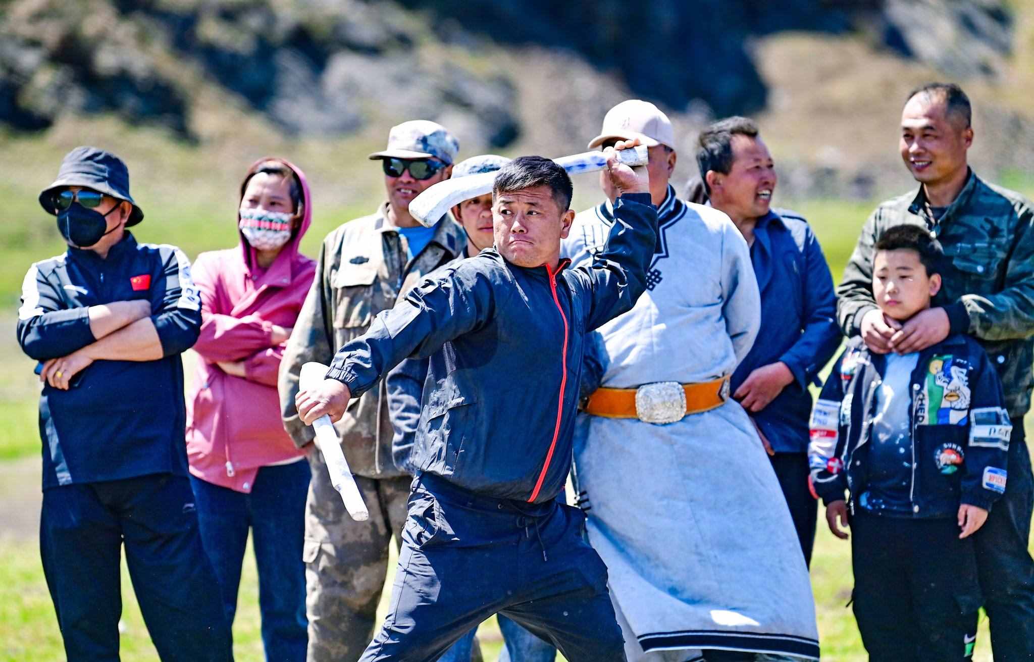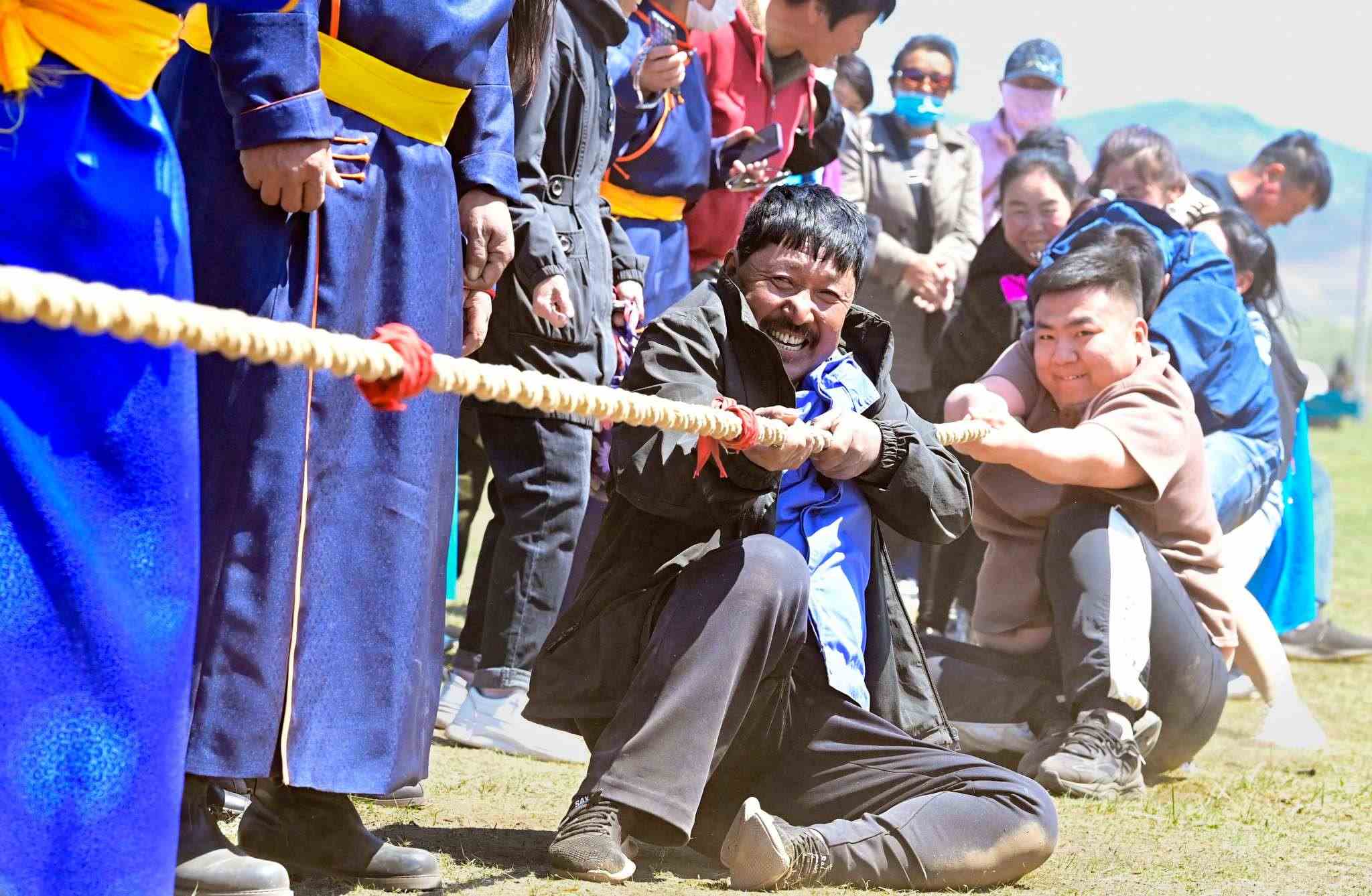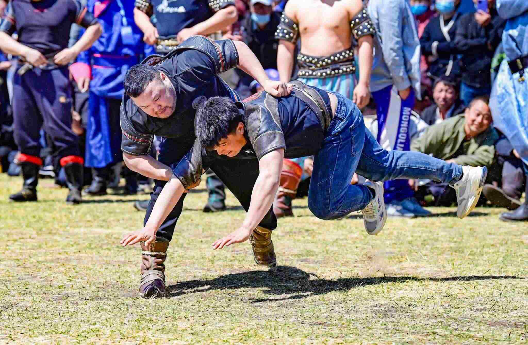 2023年5月26日,內(nèi)蒙古興安盟,科爾沁右翼前旗德伯斯鎮(zhèn)阿日林一合嘎查舉行首屆那達(dá)慕,設(shè)置的賽馬、布魯、搏克、拔河等傳統(tǒng)體育娛樂(lè)項(xiàng)目,吸引嘎查周邊500余名牧民參加比賽,喜慶牧業(yè)豐收季。視覺中國(guó)