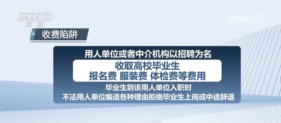 用人單位或者中介機(jī)構(gòu)以招聘為名,收取高校畢業(yè)生報(bào)名費(fèi)、服裝費(fèi)、體檢費(fèi)等費(fèi)用。畢業(yè)生到該用人單位入職時(shí),不法用人單位編造各種理由拒絕畢業(yè)生上崗或中途辭退。