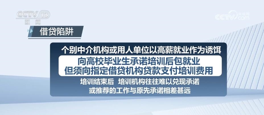 個(gè)別中介機(jī)構(gòu)或用人單位以高薪就業(yè)作為誘餌,向高校畢業(yè)生承諾培訓(xùn)后包就業(yè),但須向指定借貸機(jī)構(gòu)貸款支付培訓(xùn)費(fèi)用。培訓(xùn)結(jié)束后,培訓(xùn)機(jī)構(gòu)往往難以兌現(xiàn)承諾,或推薦的工作與原先承諾相差甚遠(yuǎn)。