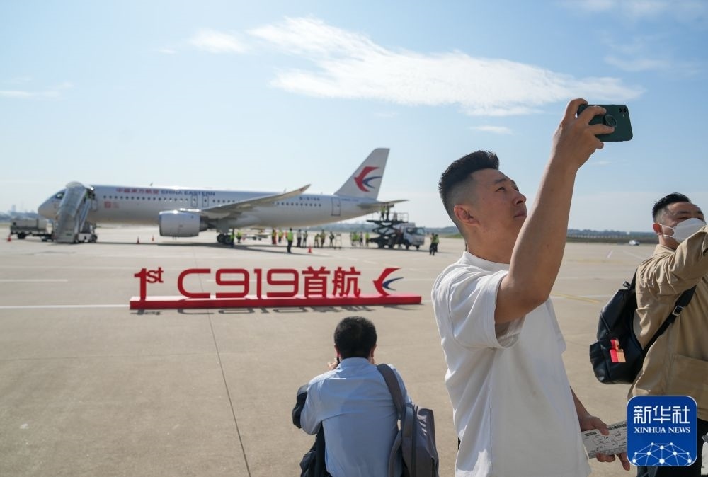 5月28日,旅客與即將首航的C919飛機(jī)合影。新華社記者丁汀攝
