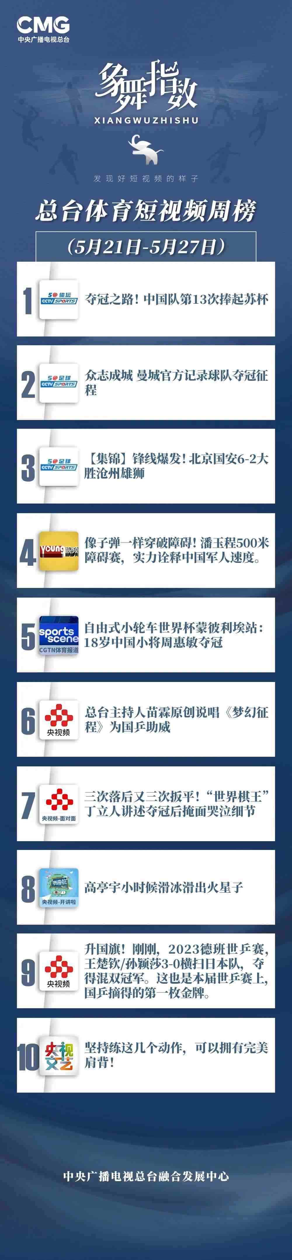 中央廣播電視總臺“象舞指數(shù)”評議品牌,推出體育短視頻周榜、總臺體育短視頻周榜。在5月21日—5月27日,以下內(nèi)容獲得矚目: