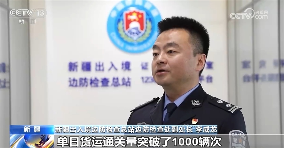 新疆出入境邊防檢查總站邊防檢查處副處長 李成龍:今年以來,霍爾果斯、阿拉山口等9個公路口岸通關量接連突破了歷史峰值,特別是霍爾果斯公路口岸,單日貨運通關量突破了1000輛次。