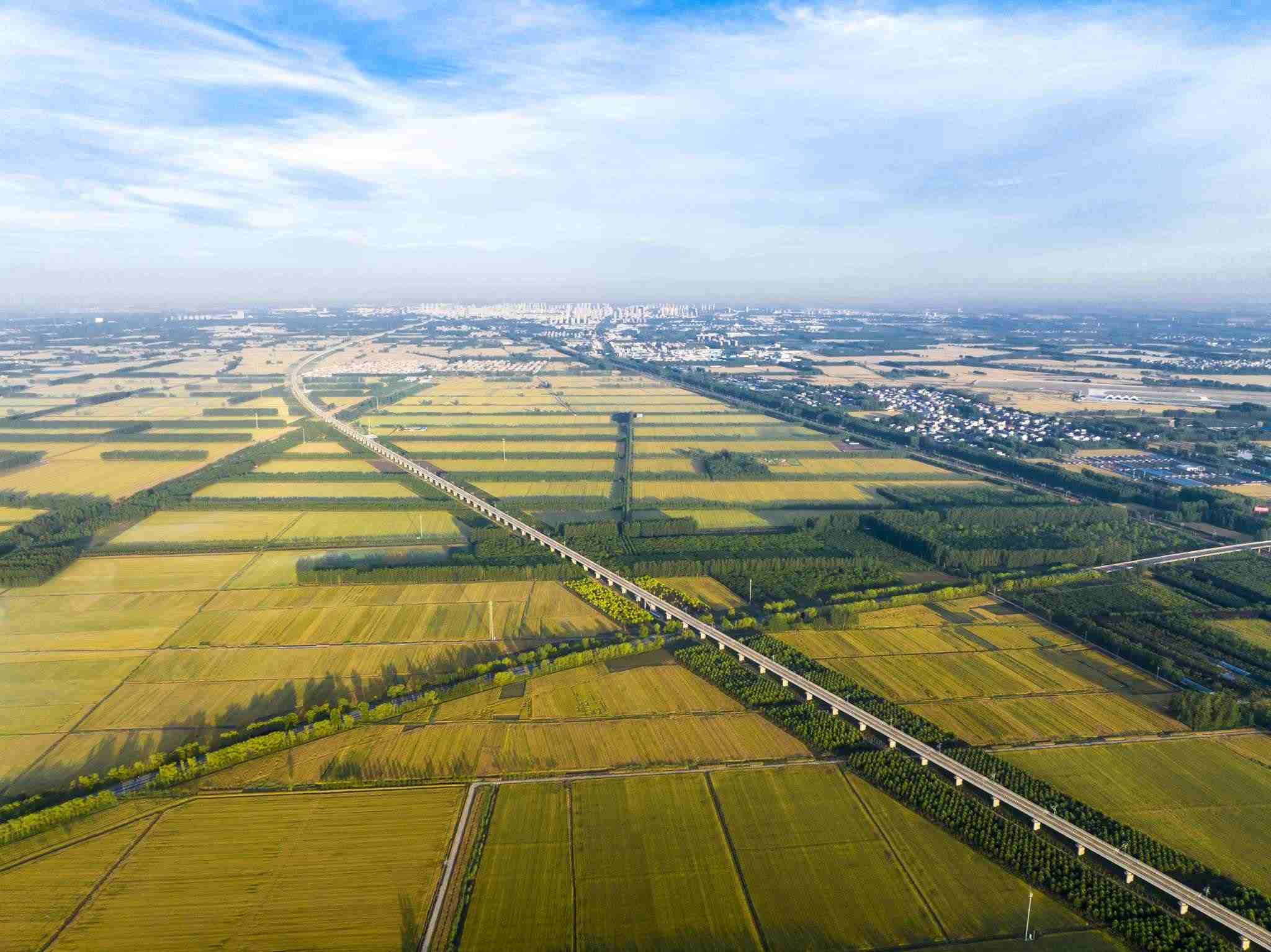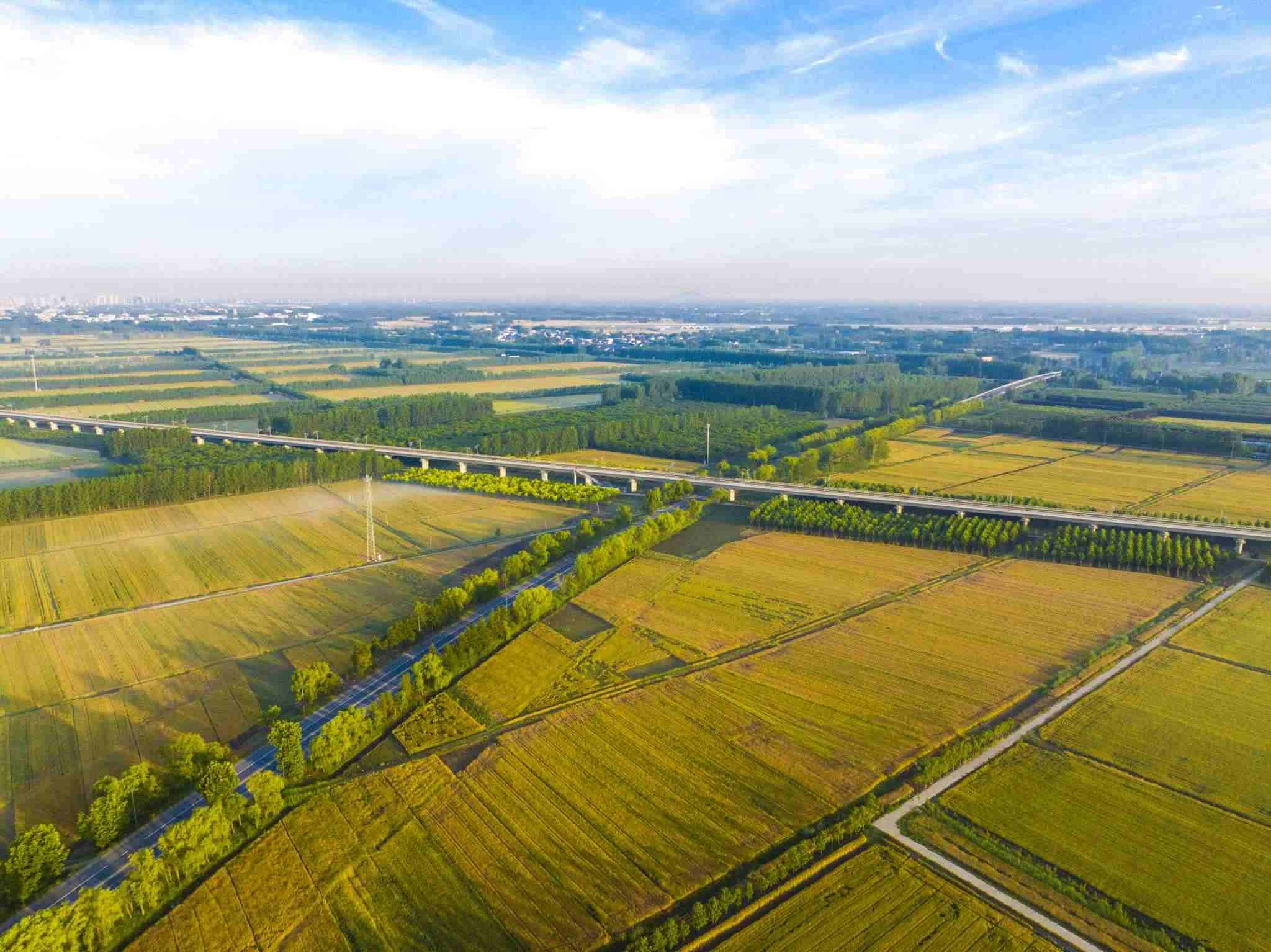 2023年6月3日,江蘇連云港,東??h,金色田野與村莊、道路、河流共同構(gòu)成了一幅秀美的夏日豐收畫卷。視覺中國(guó)