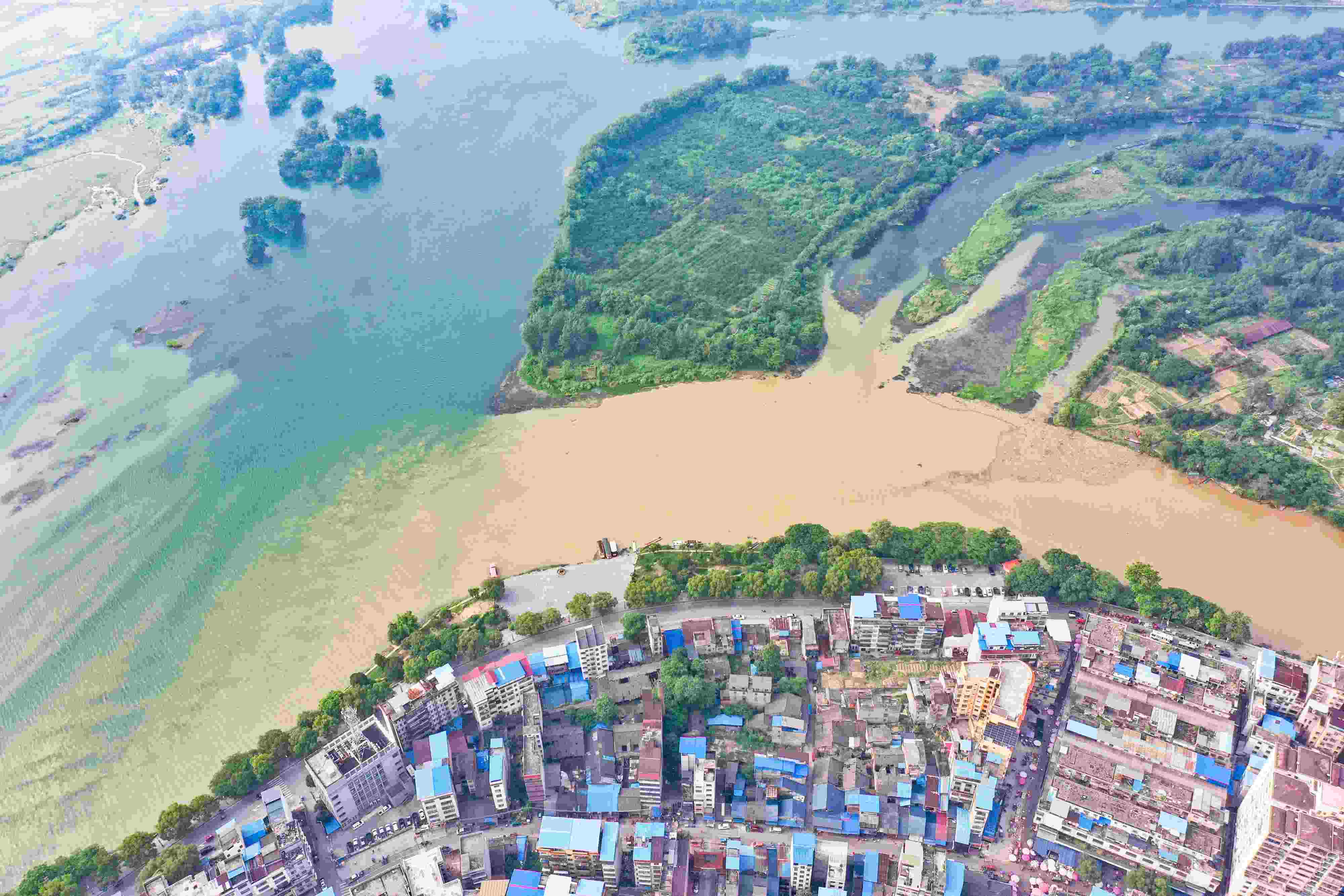 2023年6月4日,受降雨影響,廣西桂林全州縣城湘江河段出現(xiàn)涇渭分明景觀??罩懈╊?,湘江支流萬(wàn)鄉(xiāng)河混濁的河水繞城匯入清澈的湘江干流,交匯之處涇渭分明。 視覺中國(guó)