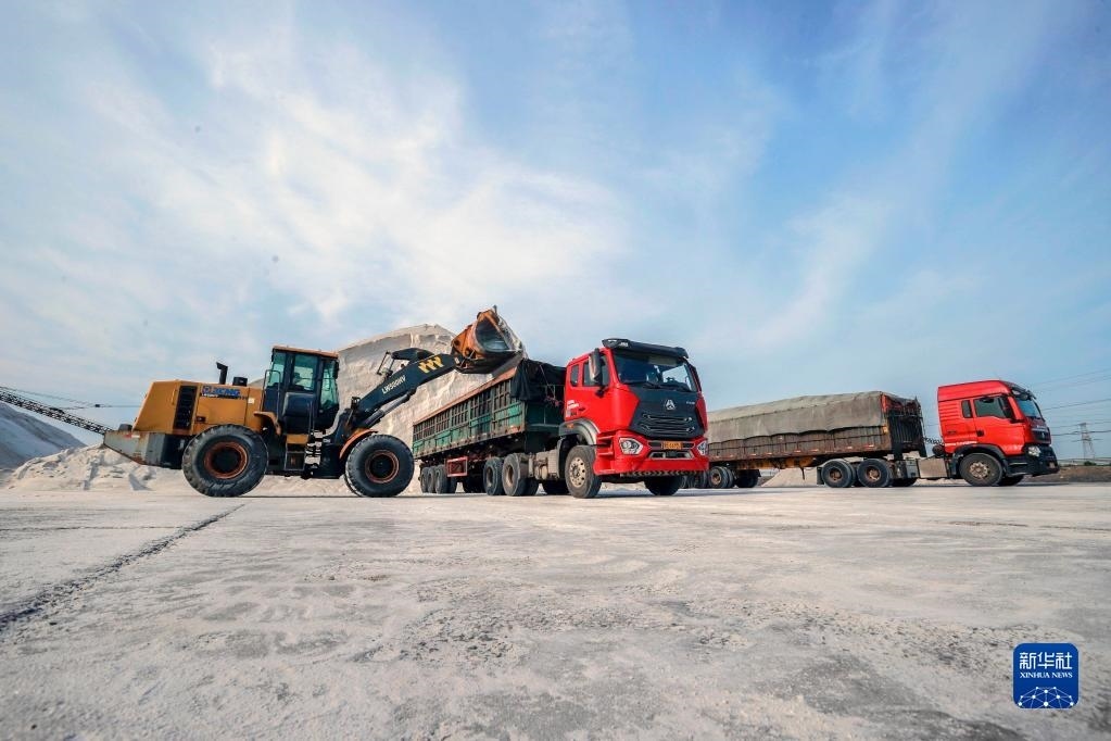 6月4日,工人操作設備在唐山海港經濟開發(fā)區(qū)長蘆大清河鹽場將海鹽裝車,準備外運。