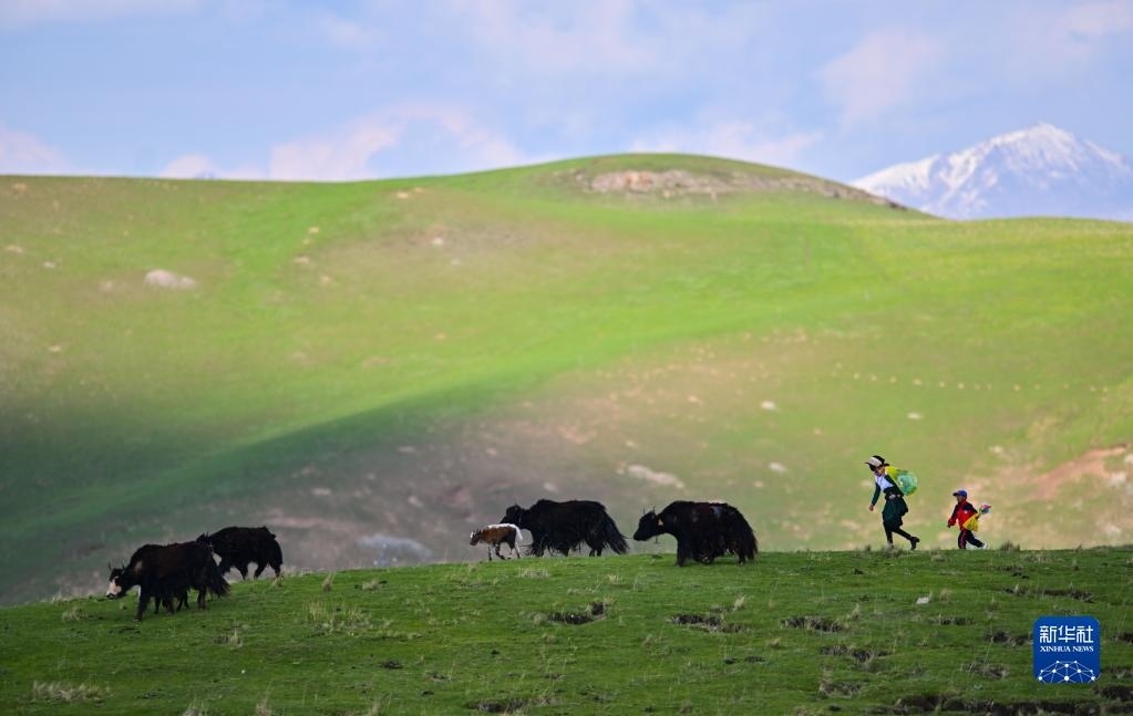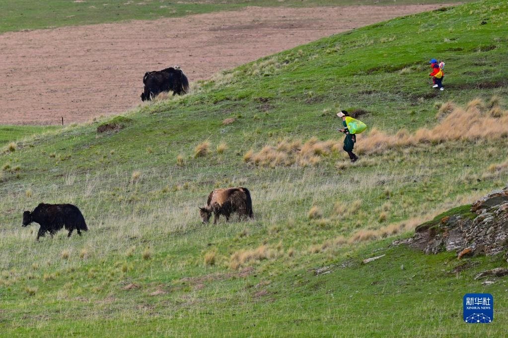 6月9日,在青海省黃南藏族自治州澤庫縣的高原草原上,當(dāng)?shù)啬撩裨诜拍痢?   新華社記者 張龍 攝