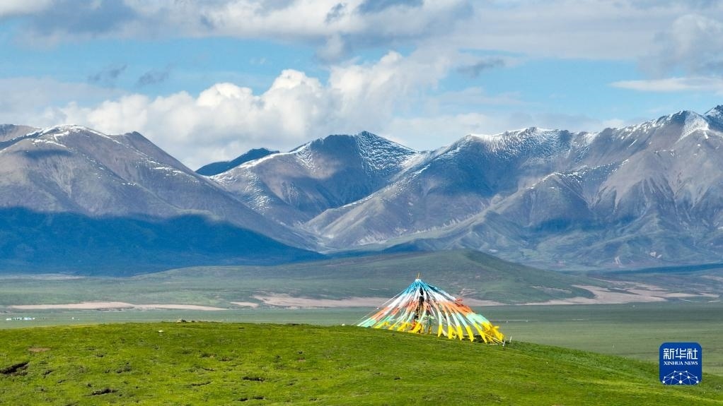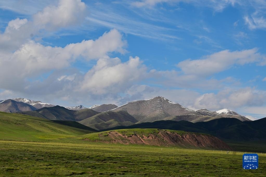 夏日,青海省南部的高原草原一碧千里,與雪山、白云相映成趣,景色宜人。   新華社記者 張龍 攝