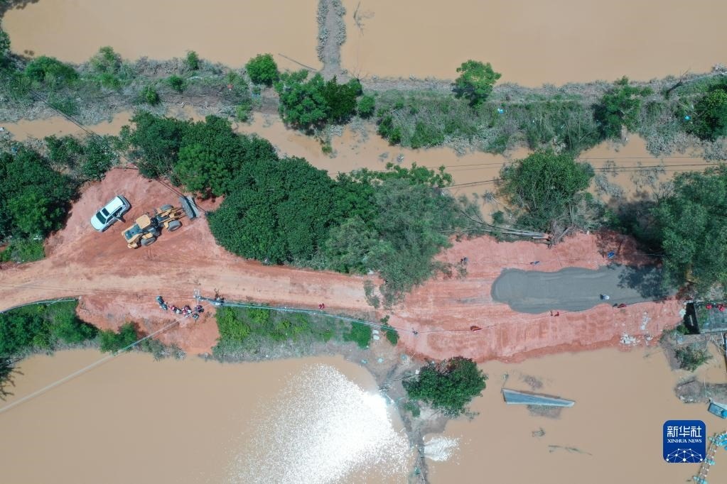 6月11日,在廣西合浦縣白沙鎮(zhèn),工人在施工修復(fù)遭洪水損毀的堤壩(無人機照片)。
