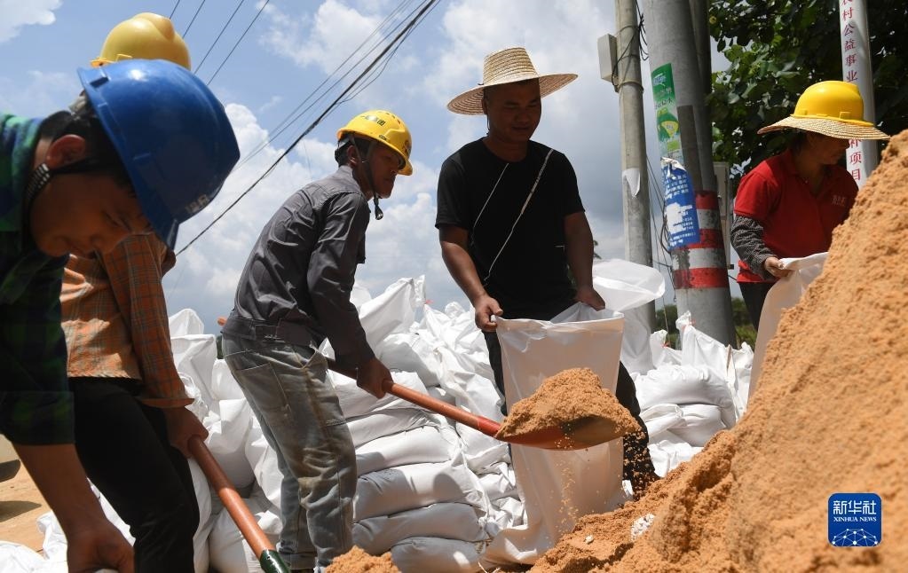 6月11日,在廣西合浦縣白沙鎮(zhèn),人們在裝沙子準備修復(fù)遭洪水損毀的堤壩。   新華社記者 陸波岸 攝