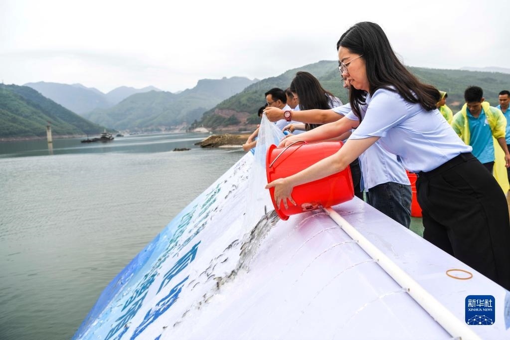 6月15日,在廣西大藤峽水利樞紐工程,工作人員在放魚苗。