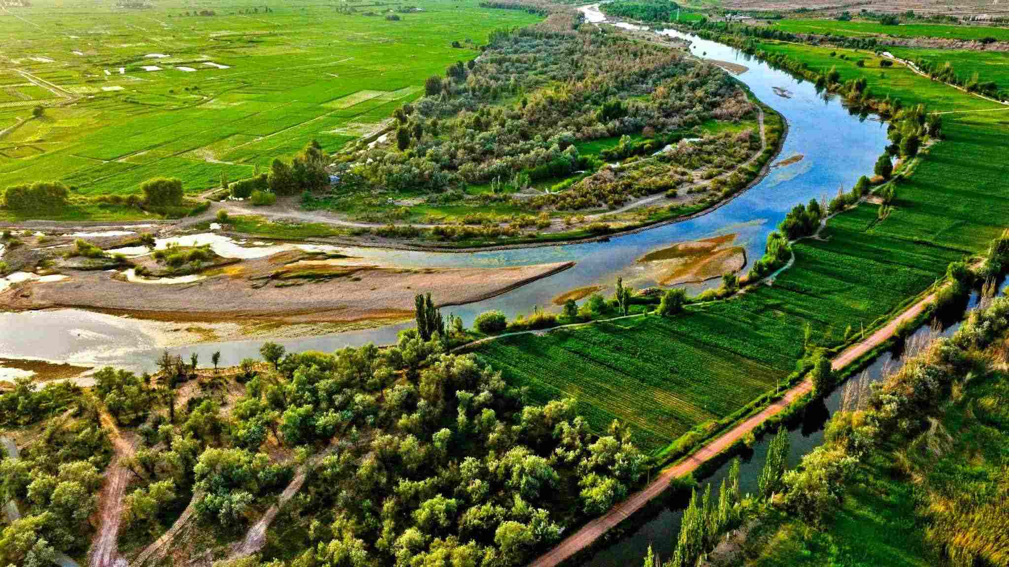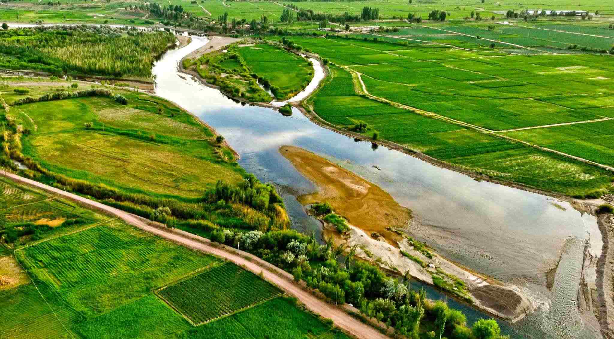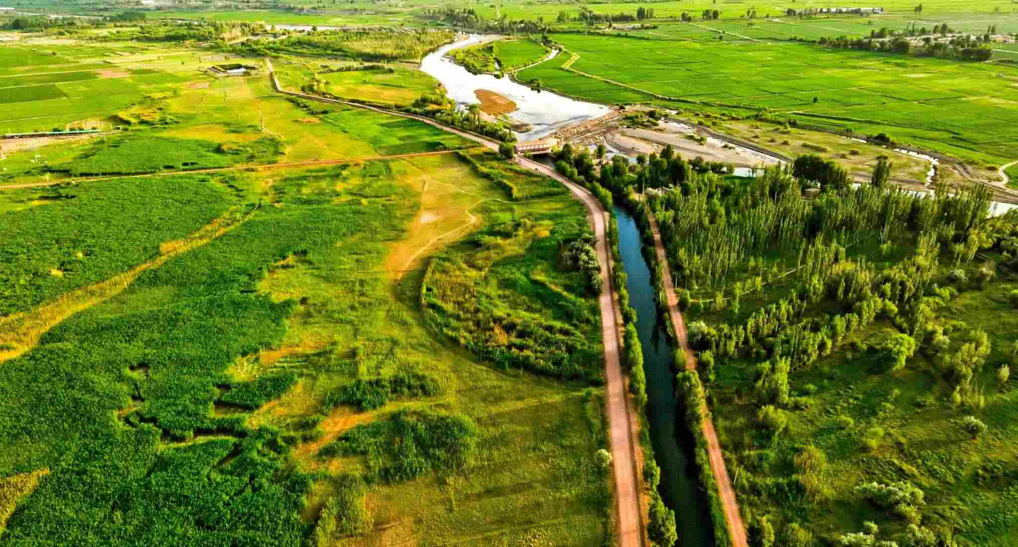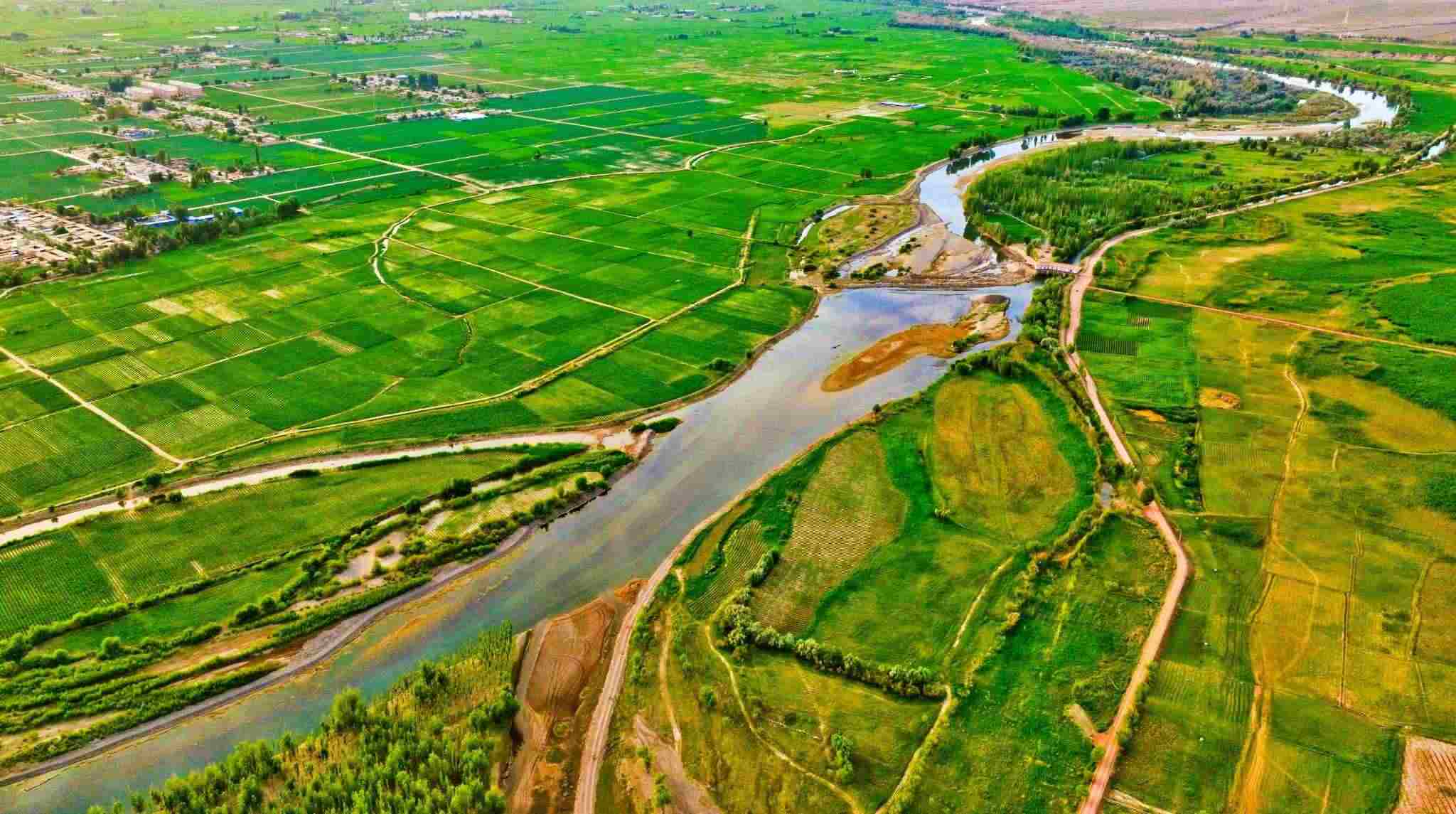 2023年6月15日,甘肅省張掖市,甘州區(qū)靖安鄉(xiāng)、臨澤縣板橋鎮(zhèn)境內(nèi)的黑河兩岸,寬闊的河床、彎曲的河流、農(nóng)作物以及樹木、蘆葦、濕地在夕陽的映照下綠意盎然。視覺中國(guó)