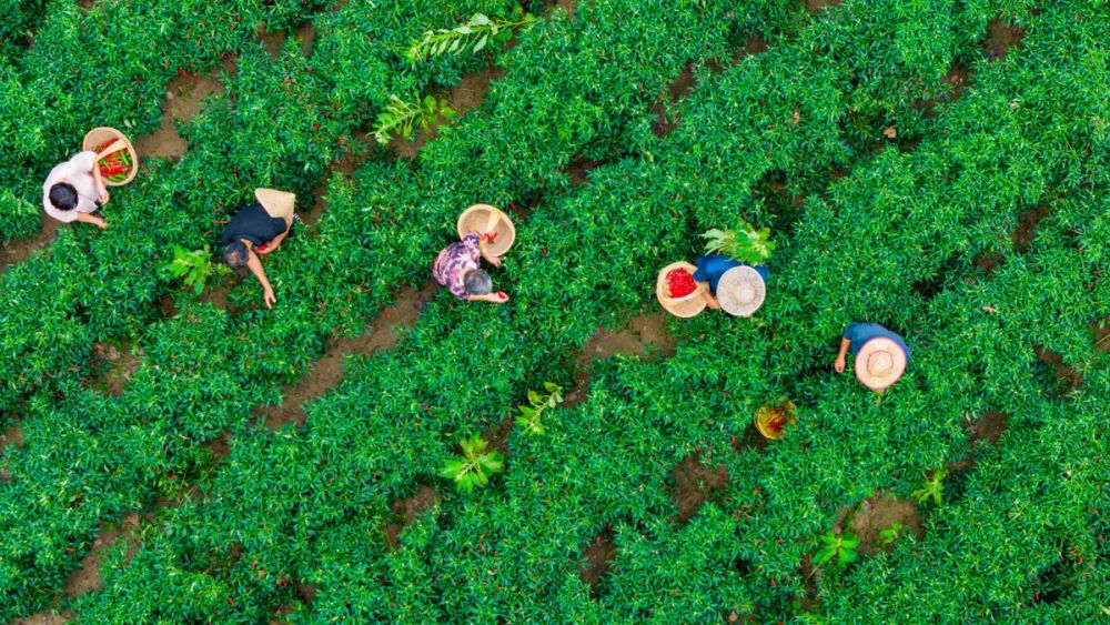 ↑2023年8月28日,河南省商丘市寧陵縣黃崗鎮(zhèn)商會(huì)南魏果蔬種植專業(yè)合作社,農(nóng)民在采摘辣椒。CICPHOTO/徐碩 攝
