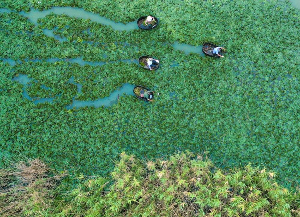 ↑2023年8月24日,浙江省湖州市長(zhǎng)興縣夾浦鎮(zhèn)陶家灣村,菱農(nóng)在采收菱角。CICPHOTO/陳海偉 攝