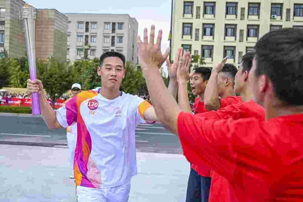 ↑火炬手吳一銳在火炬?zhèn)鬟f中。