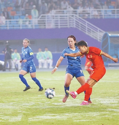 9月22日,亞運(yùn)女足小組賽,中國女足以16∶0戰(zhàn)勝蒙古國女足。圖為隊員在比賽中。本報記者 張武軍攝