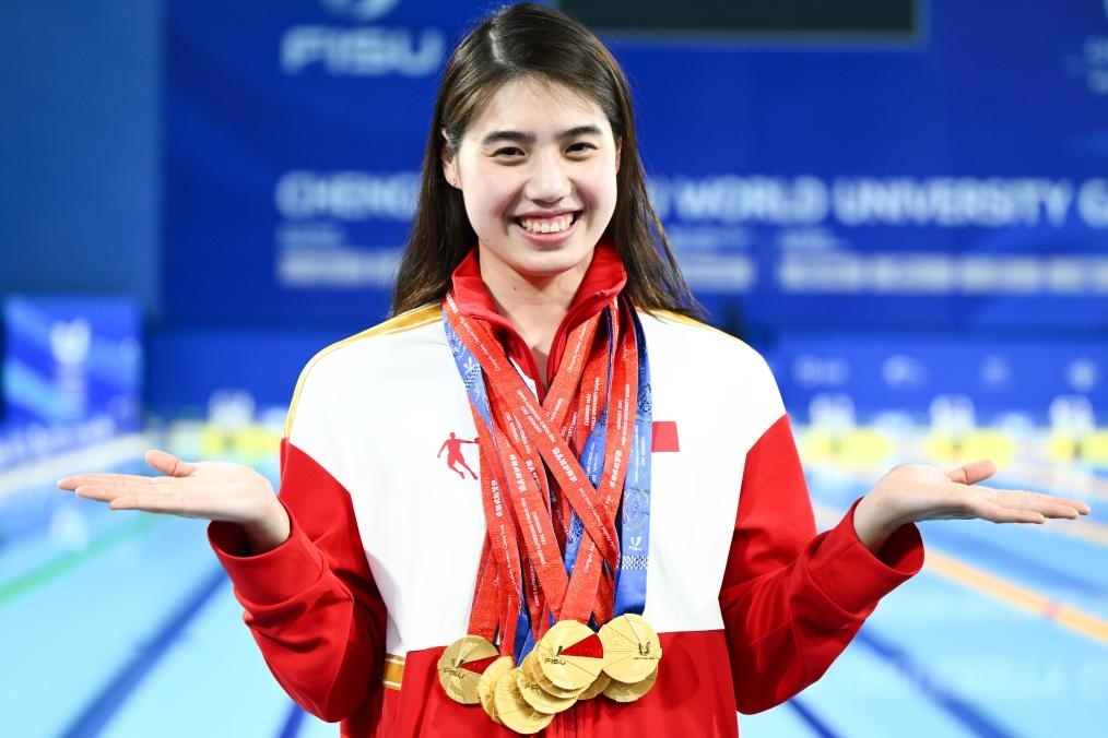 8月7日,參加成都大運(yùn)會的張雨霏展示她獲得的九枚金牌。新華社記者 吳剛 攝