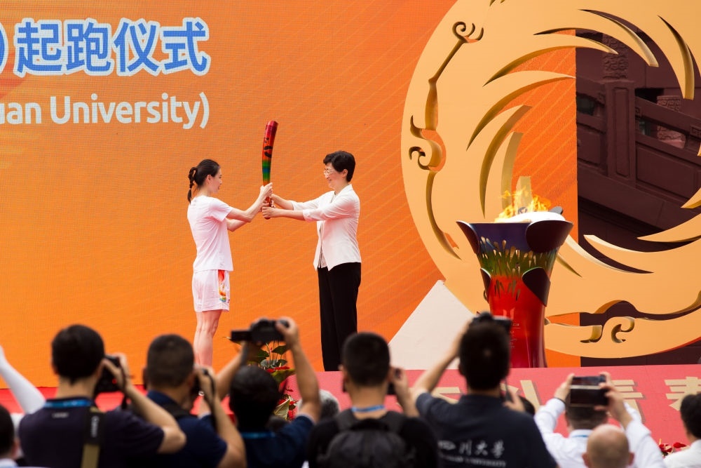 7月2日,第一棒火炬手吳敏霞(左)接過點(diǎn)燃的火炬。當(dāng)日,成都第31屆世界大學(xué)生夏季運(yùn)動(dòng)會(huì)火炬?zhèn)鬟f成都站起跑儀式在四川大學(xué)校園內(nèi)舉行。新華社發(fā)(曹鵬攝)