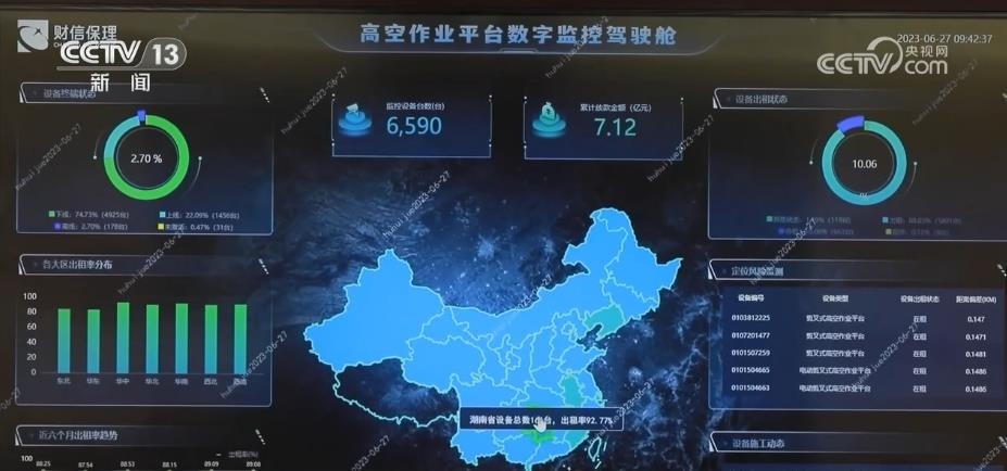 在湖南這家金融機(jī)構(gòu)的大屏幕上,一個(gè)個(gè)小點(diǎn)組成了全國6500多臺(tái)高空作業(yè)設(shè)備的實(shí)時(shí)運(yùn)行數(shù)據(jù)圖。動(dòng)動(dòng)手指,生產(chǎn)的每臺(tái)設(shè)備的地理位置、開機(jī)狀態(tài)和運(yùn)行情況等數(shù)據(jù)都清晰可見。