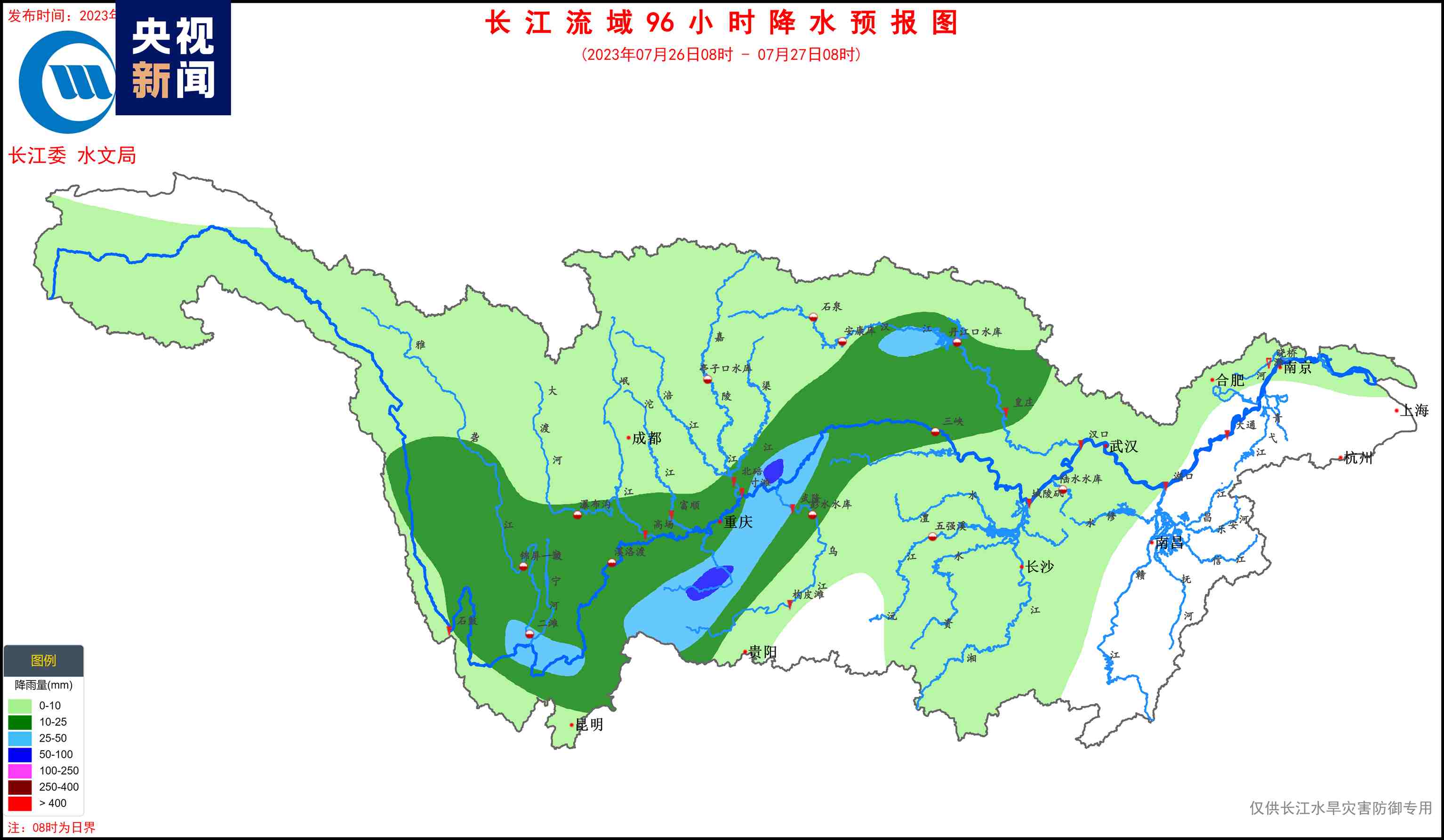 據(jù)水文氣象預(yù)報(bào),7月23日,嘉岷流域北部有中雨、局地大雨;24~27日,長(zhǎng)江上游干流附近有中到大雨、局地暴雨的降水過(guò)程,過(guò)程累計(jì)面雨量:長(zhǎng)江上游干流70毫米,金沙江中下游、雅礱江、岷沱江、渠江、烏江上游30~50毫米??紤]預(yù)見(jiàn)期降雨,金沙江中下游、嘉岷流域、赤水河、烏江、三峽區(qū)間將發(fā)生漲水過(guò)程,降雨落區(qū)內(nèi)部分中小河流可能發(fā)生超警洪水,局部強(qiáng)降雨引發(fā)山洪災(zāi)害的風(fēng)險(xiǎn)高。