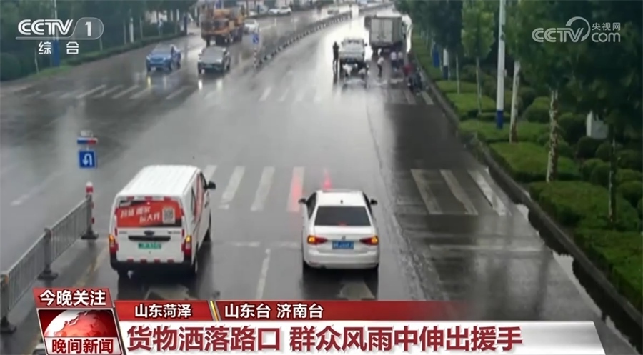 近日,山東菏澤定陶區(qū)出現(xiàn)持續(xù)強(qiáng)降雨過(guò)程,因雨天路滑,一輛載滿(mǎn)貨物的車(chē)輛轉(zhuǎn)彎時(shí),車(chē)上裝載的一噸多礦泉水灑落一地,風(fēng)大雨急,貨車(chē)司機(jī)束手無(wú)策。這時(shí),又一輛貨車(chē)停在了車(chē)前,從車(chē)上下來(lái)三位女士幫助貨車(chē)司機(jī)搬運(yùn)貨物,過(guò)往群眾也紛紛冒雨參與其中。在大家共同努力下,灑落的貨物十分鐘就被整理干凈。