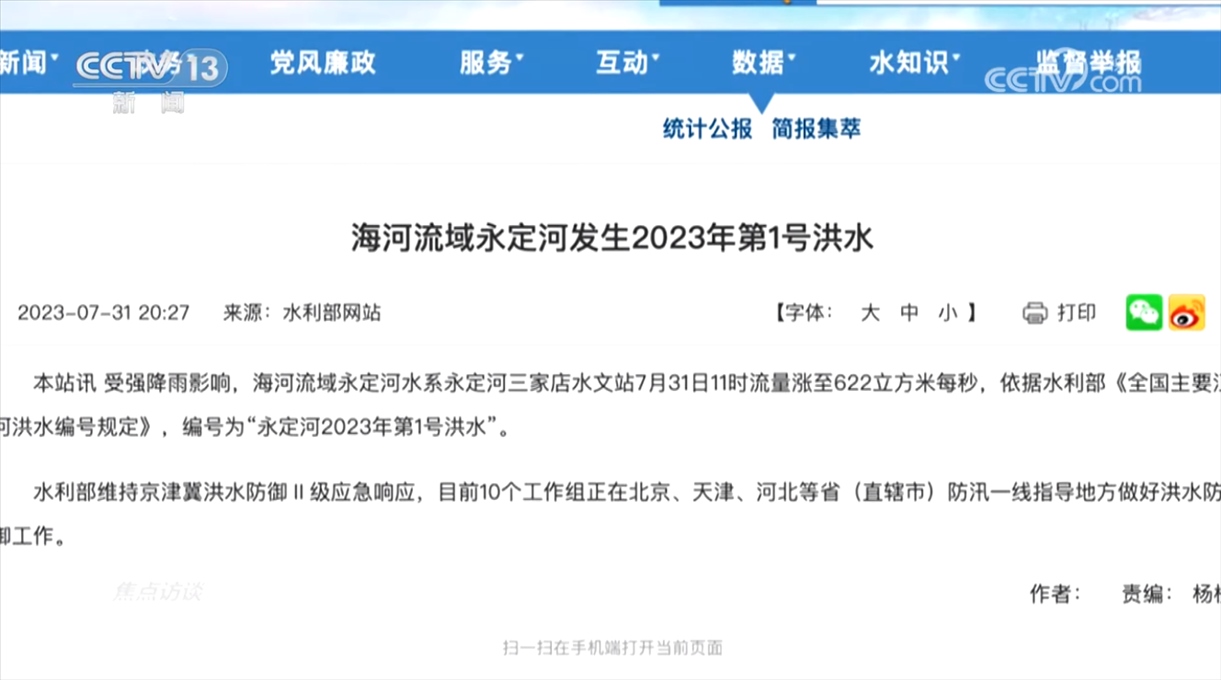 7月30日和31日,水利部接連發(fā)出三條編號洪水通知:海河流域子牙河發(fā)生2023年第1號洪水、海河流域永定河發(fā)生2023年第1號洪水、海河流域大清河發(fā)生2023年第1號洪水。